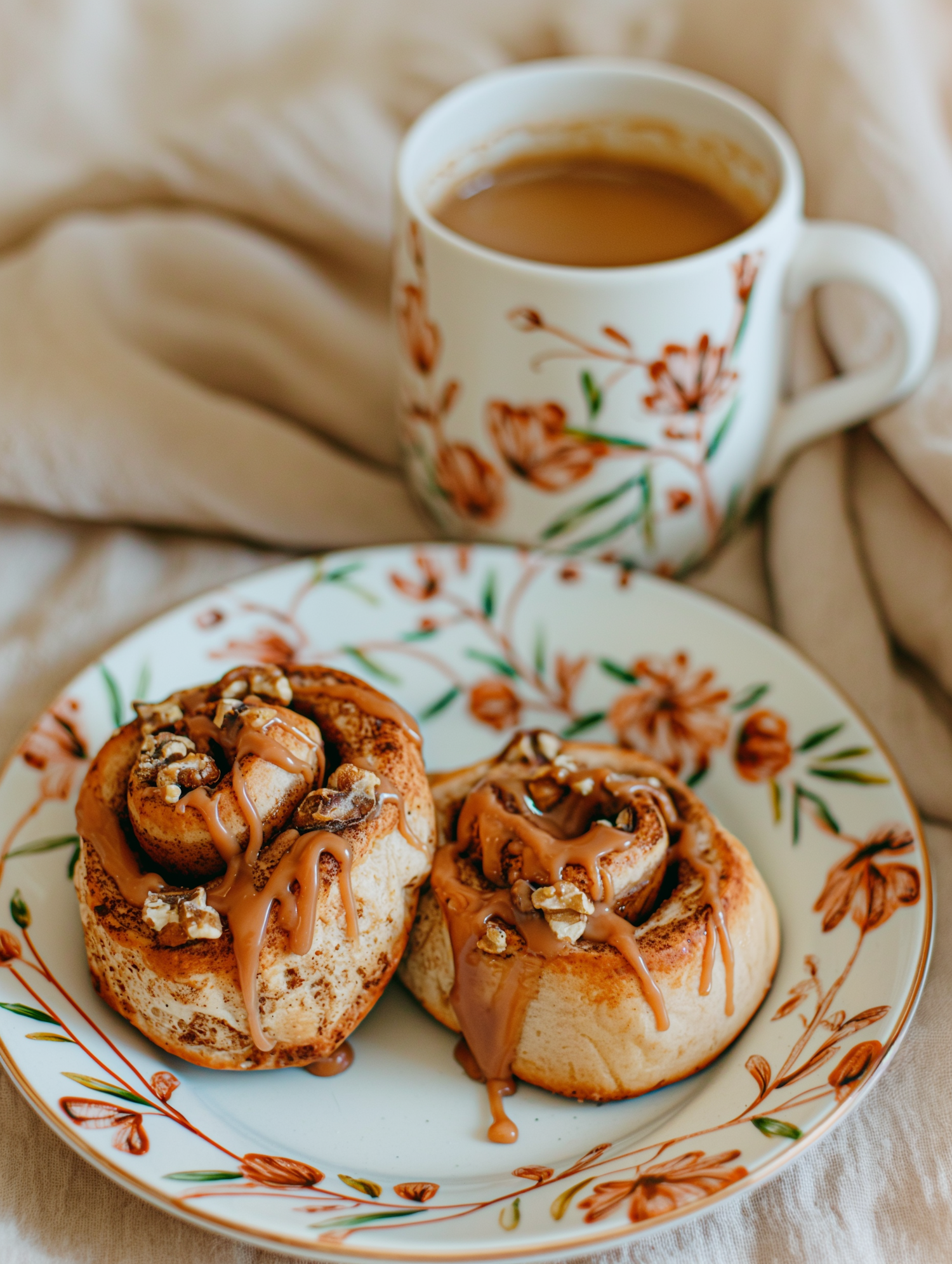 Warm cinnamon rolls with caramel and nuts on a floral plate, paired with a matching mug of coffee. Cozy breakfast vibes.