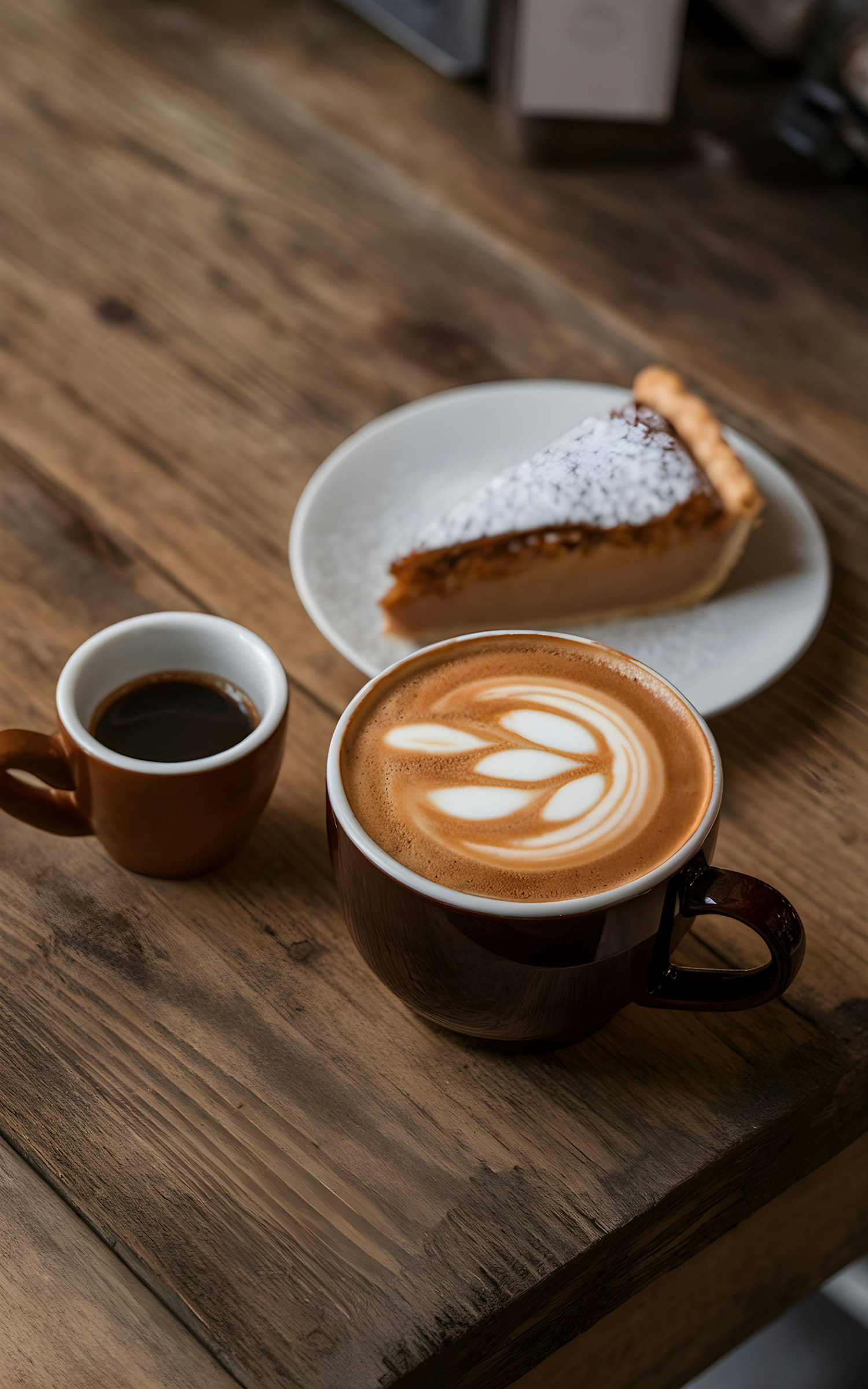 Cozy coffee setup with latte art, espresso, and a slice of pie on a rustic wooden table.