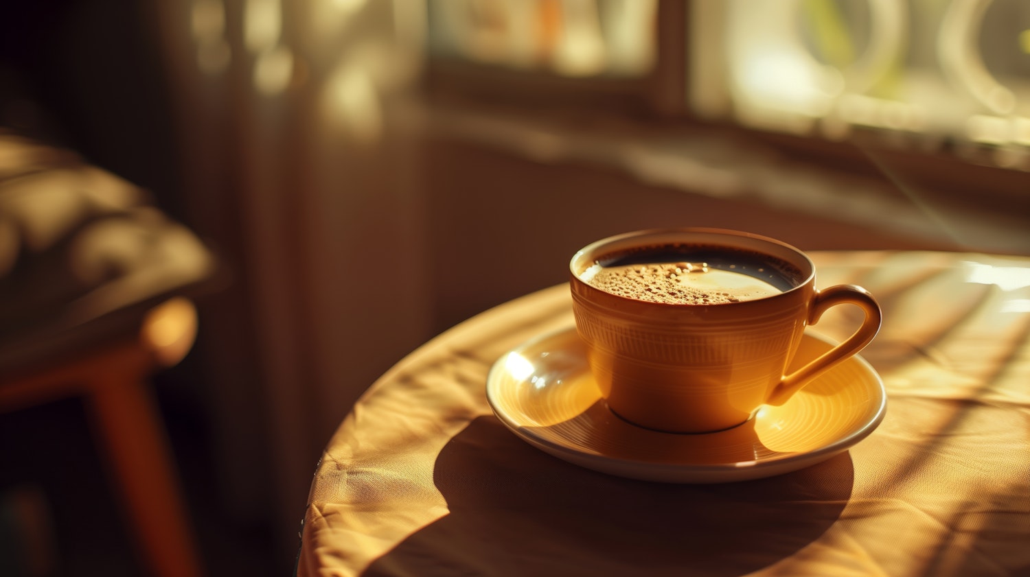 Cozy yellow coffee cup on a sunlit table, creating a warm and inviting atmosphere with soft shadows and golden light.