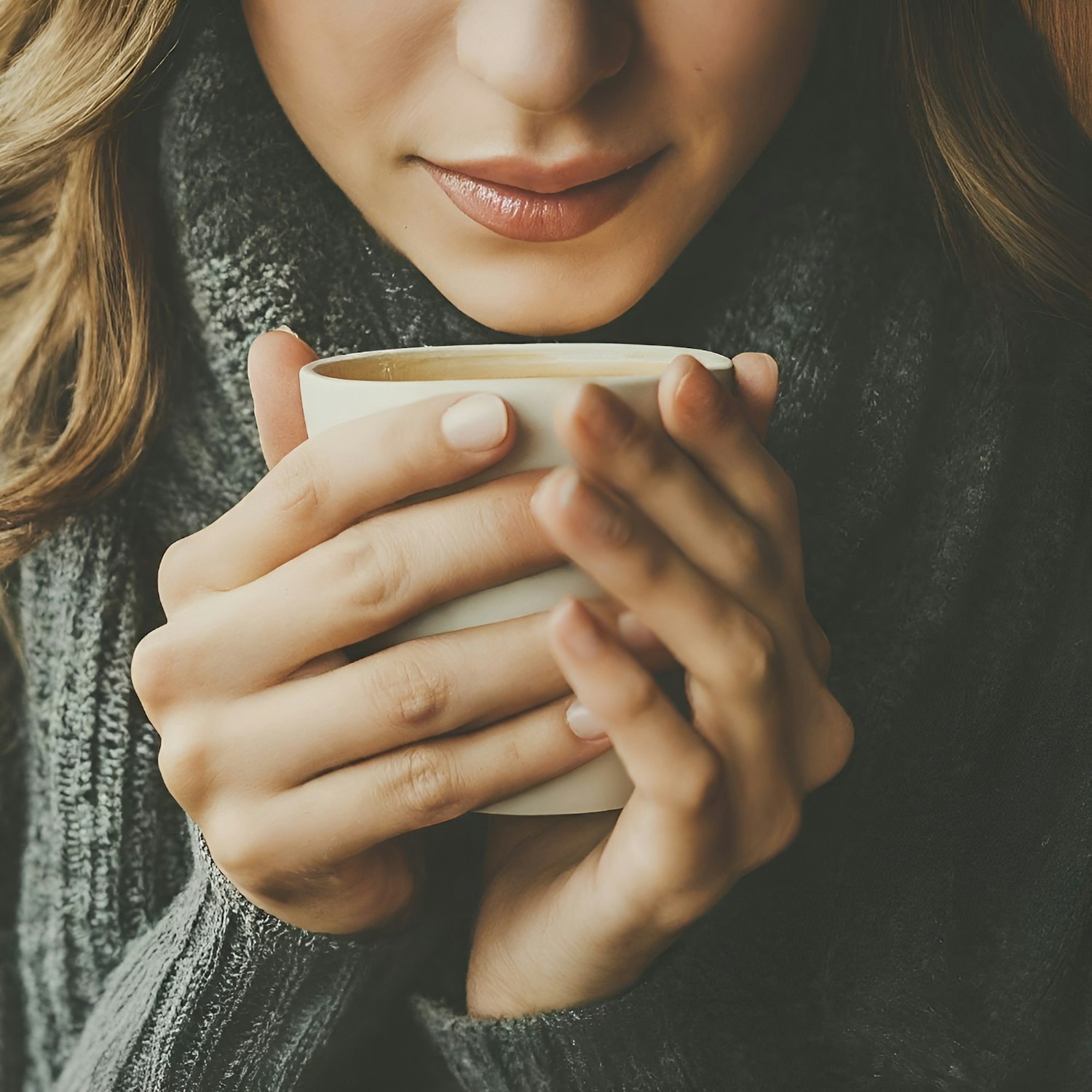 Close-up of a person holding a warm coffee cup, wearing a cozy gray sweater. Warm and inviting atmosphere.