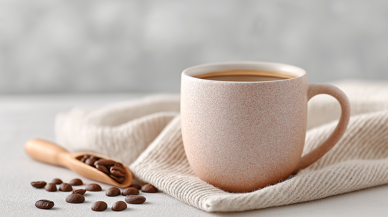 Speckled ceramic coffee mug on beige fabric with roasted coffee beans in a wooden scoop. Warm, cozy tones for a relaxing vibe.