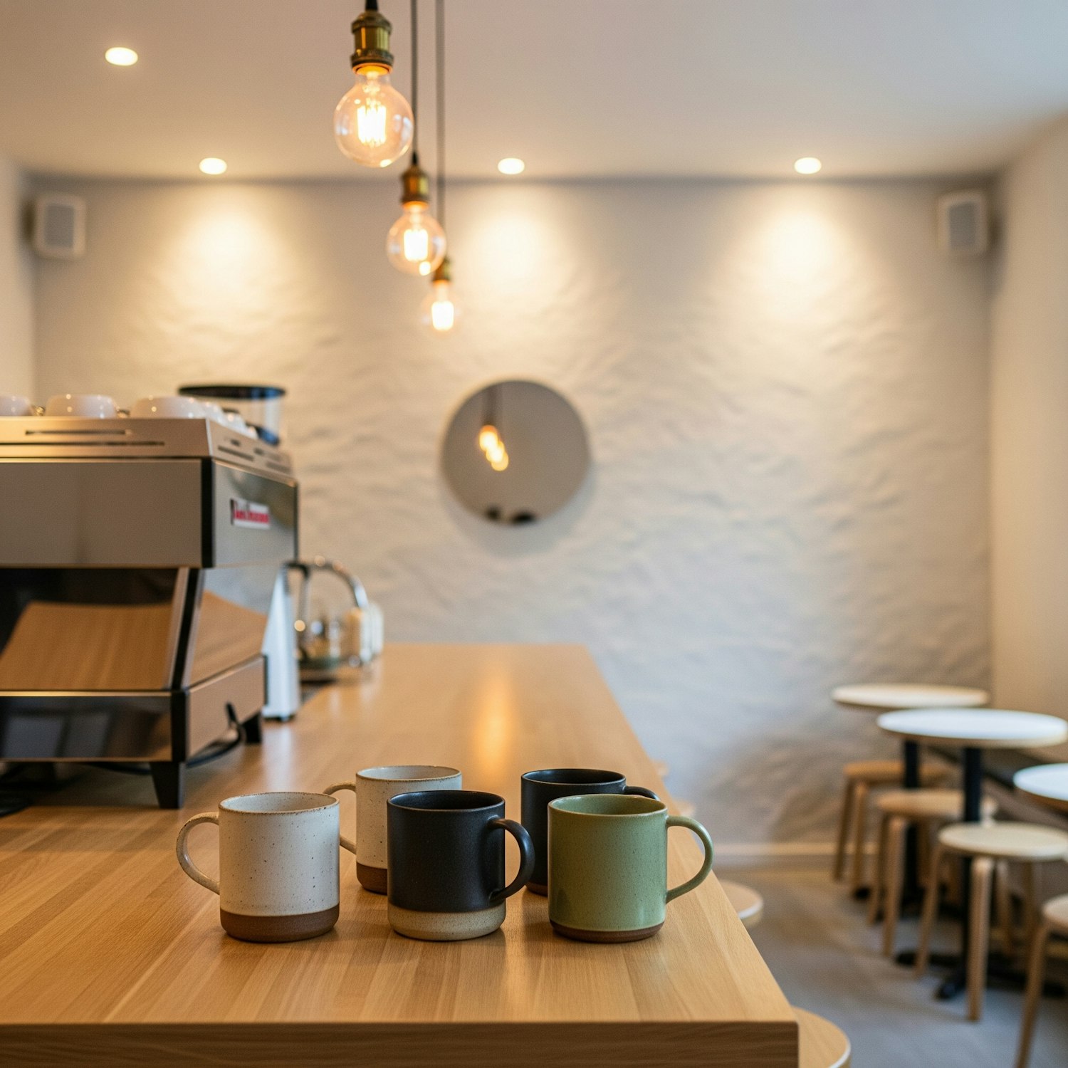 Warm coffee shop interior with a wooden counter, colorful mugs, pendant lights, and a cozy seating area with a modern espresso machine.