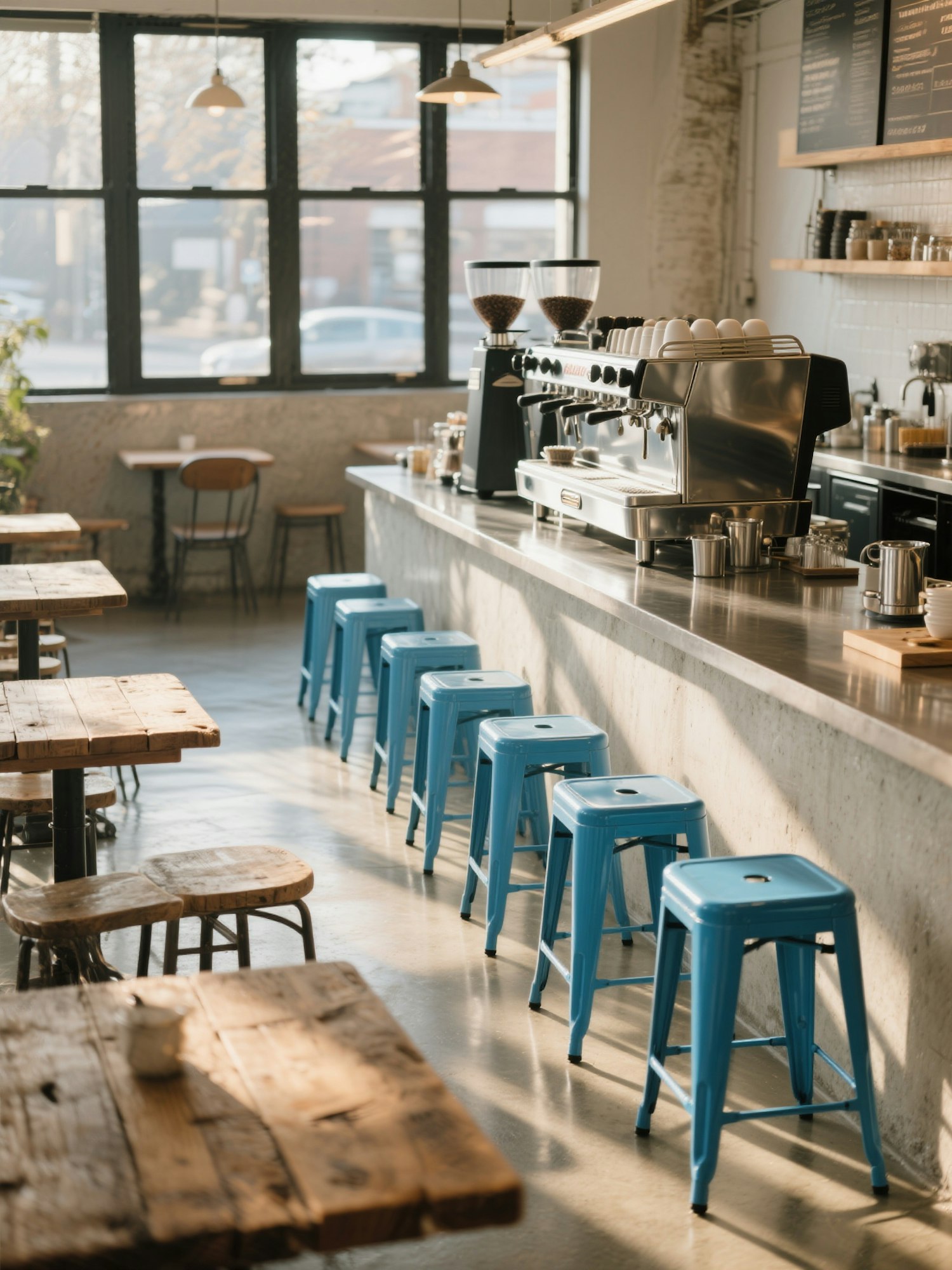 A modern coffee shop with blue stools, wooden tables, and a sleek espresso machine, bathed in natural light from large windows.