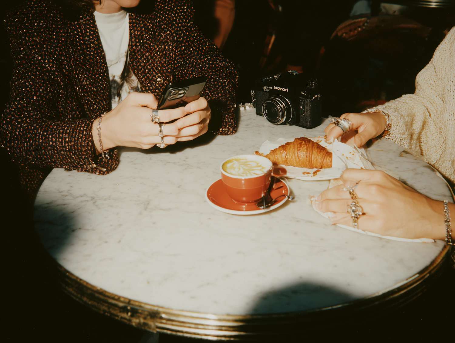 Two people enjoy coffee and a croissant at a marble table, with a vintage camera adding charm to the cozy scene.