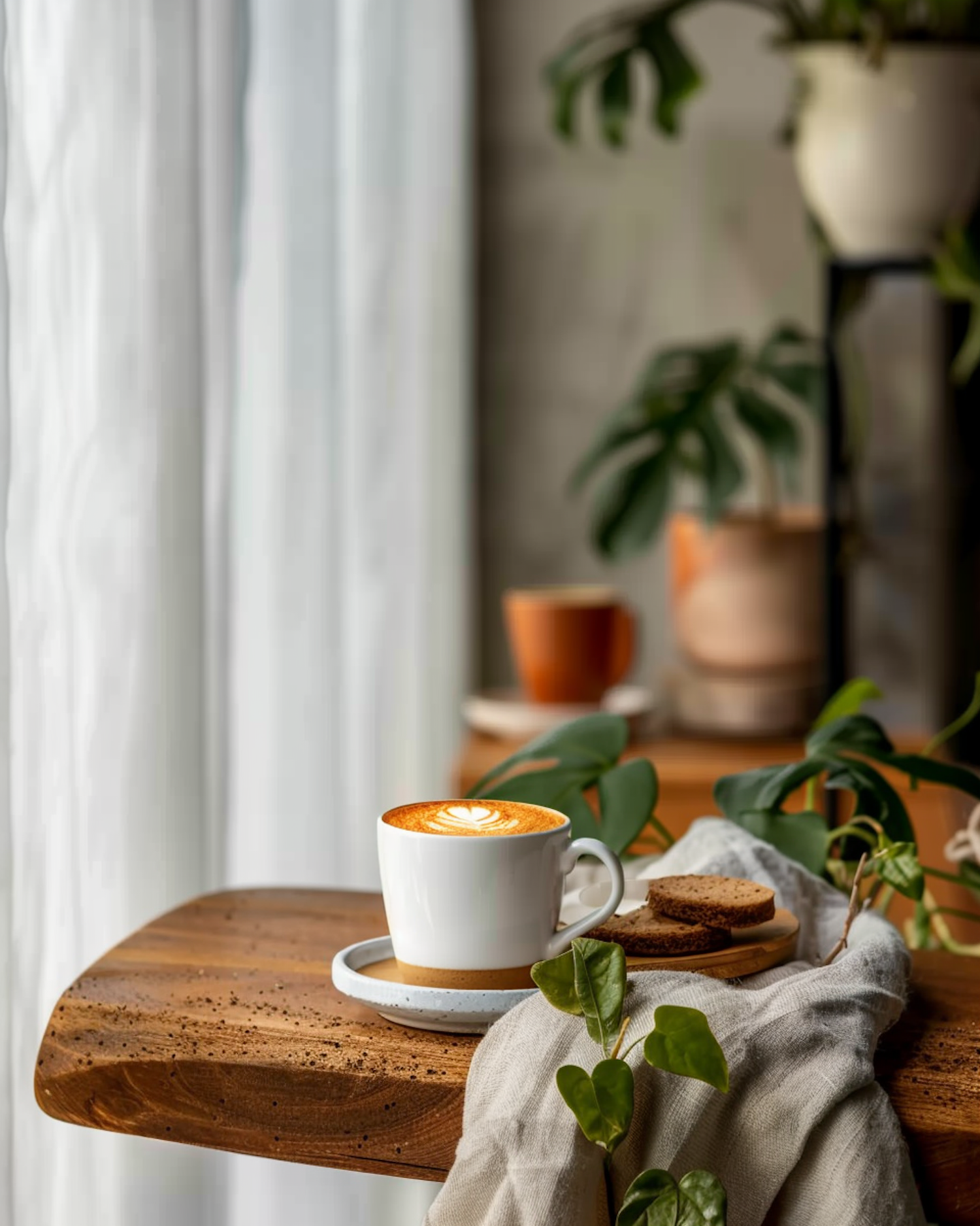 Cozy coffee setup with latte art, rustic wooden table, bread slices, and lush green plants in soft natural light.