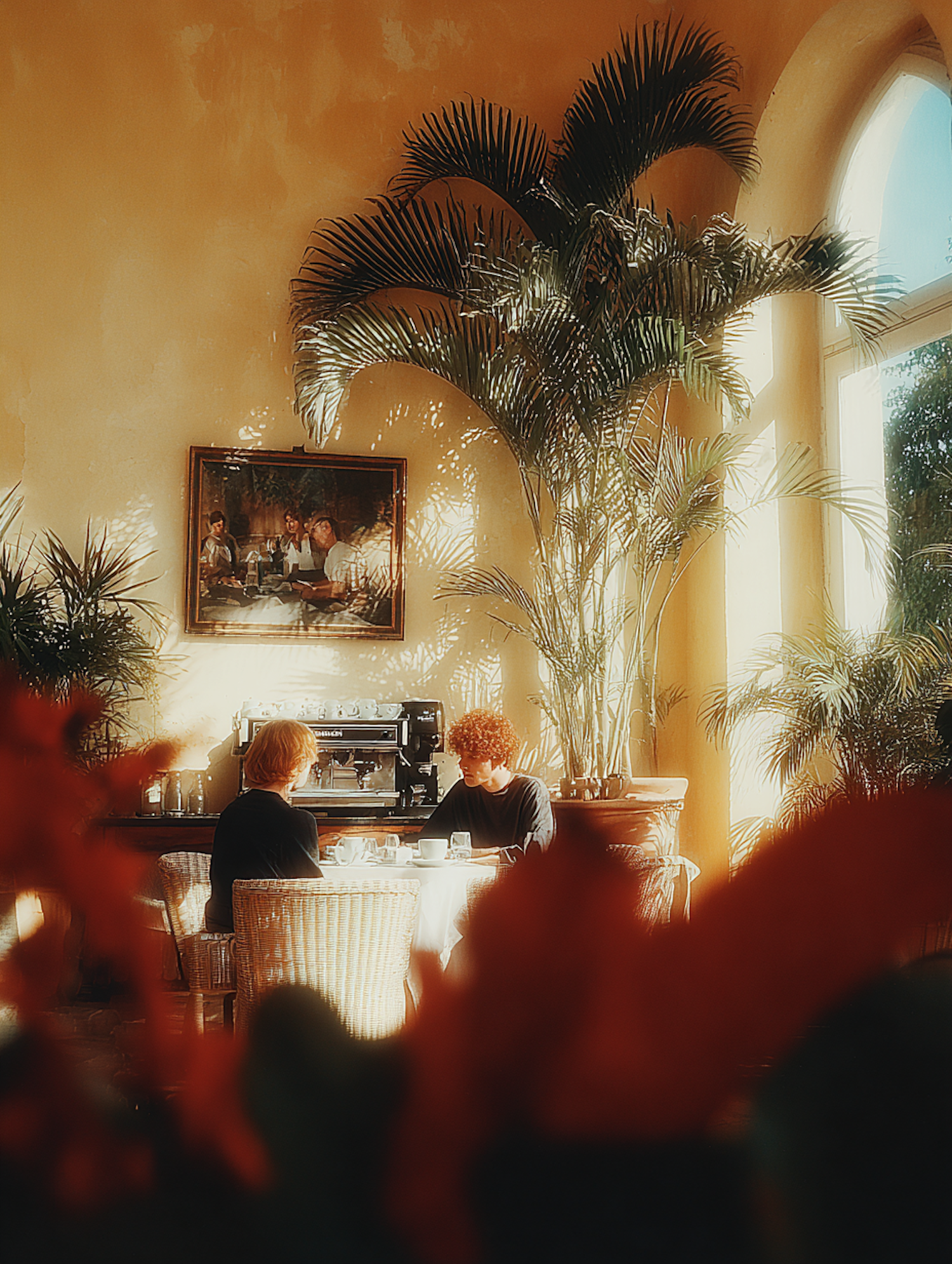 A cozy cafe scene with two people conversing at a table, surrounded by lush plants and warm lighting from large arched windows.