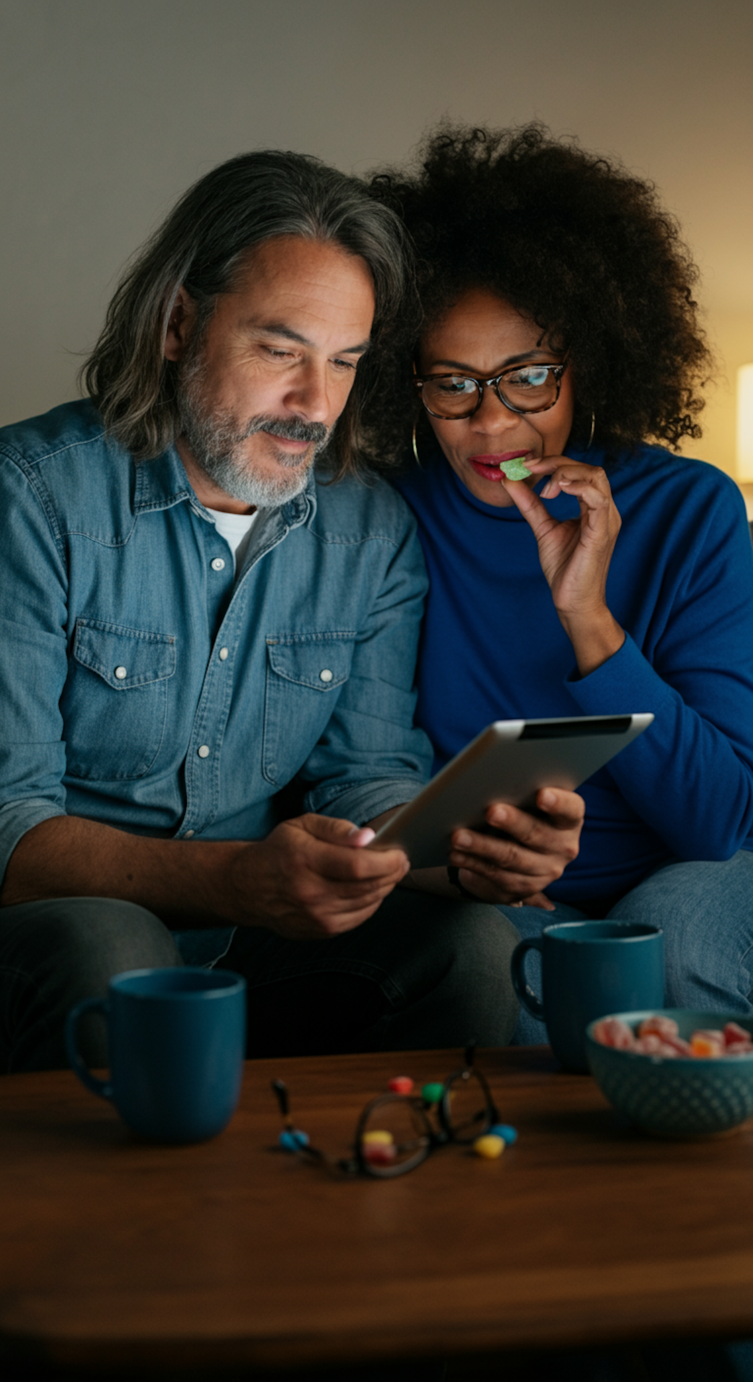 A couple relaxes on a couch, sharing a tablet and enjoying snacks with warm lighting and a cozy vibe.