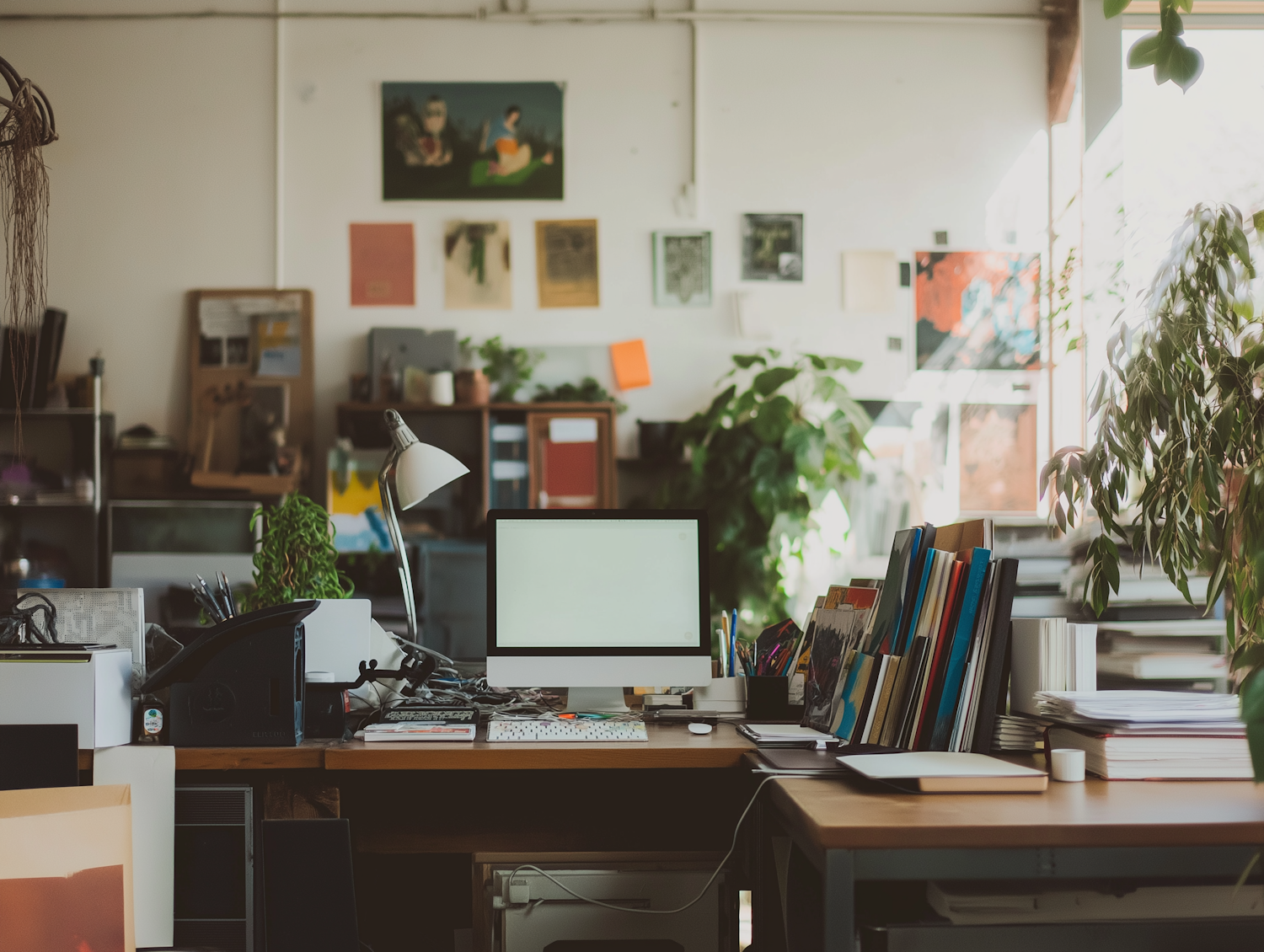 Creative workspace with a cluttered desk, computer, books, and art on the walls. Natural light and plants add a cozy, artistic vibe.