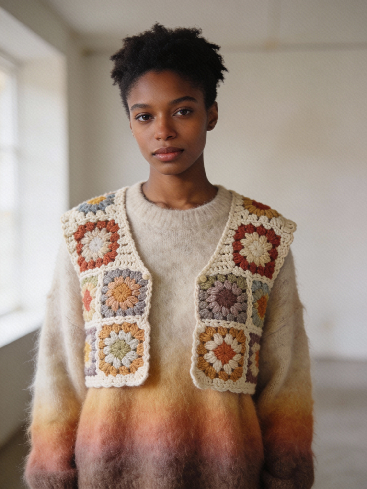A Black woman wearing a handmade granny‑square bolero layered over an oversized gradient mohair sweater, combining cozy texture with playful, artisanal detail. The relaxed silhouette and soft fibers create a warm, tactile look. Her serene expression, gentle eyes, and soft gaze convey calm confidence. She has a trendy, well‑styled hairstyle that adds a modern touch. Ambient neutral lighting highlights the knit textures within a minimalist, uncluttered setting.