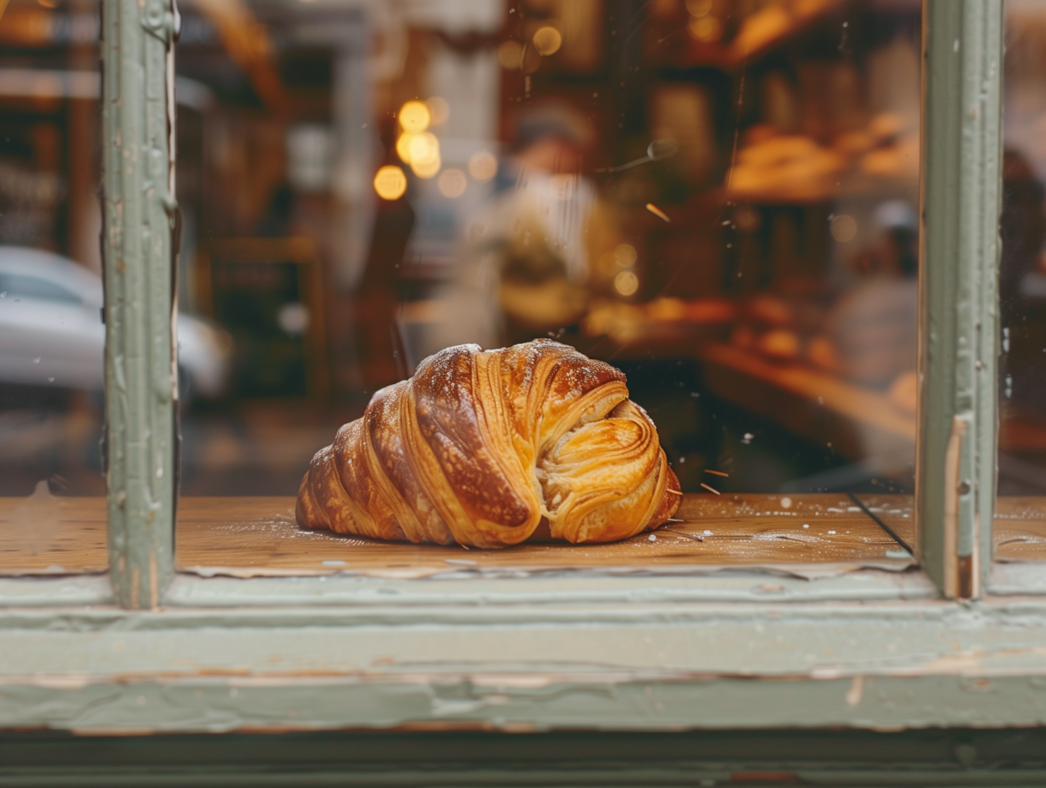 Golden croissant behind a rustic window, dusted with sugar, in a cozy bakery setting with warm lighting and blurred background.