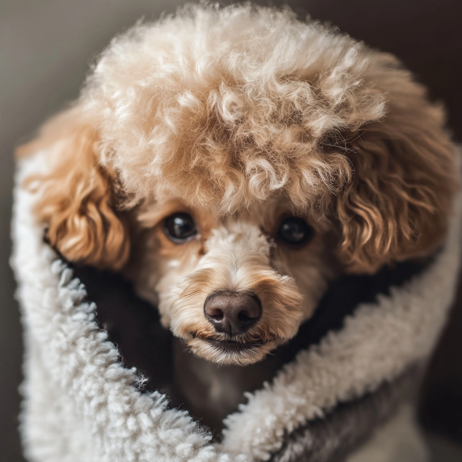 Adorable small dog with curly fur wrapped in a cozy blanket, looking curiously with expressive eyes. Warm and inviting scene.