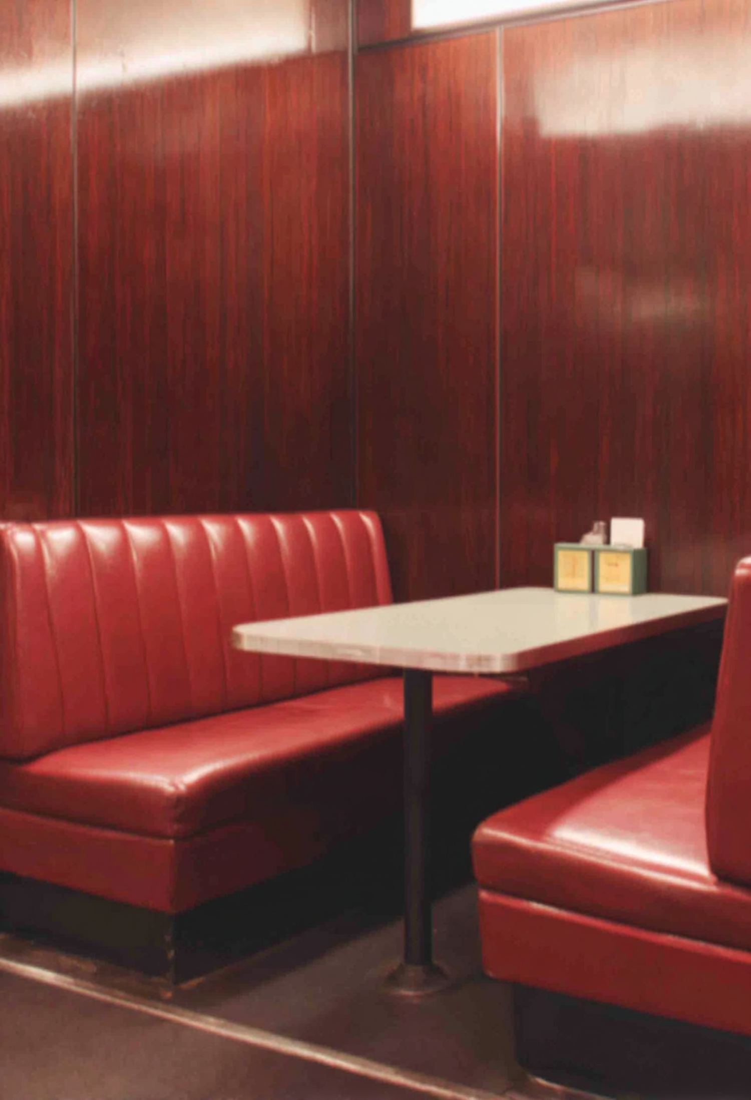 A classic diner booth with red leather seats and a white table, set against rich wooden paneling for a nostalgic feel.