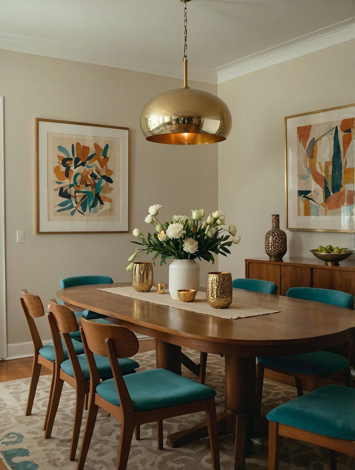 Mid-century modern dining room with teal chairs, brass pendant light, and abstract art. Features a wooden table and white tulip centerpiece.