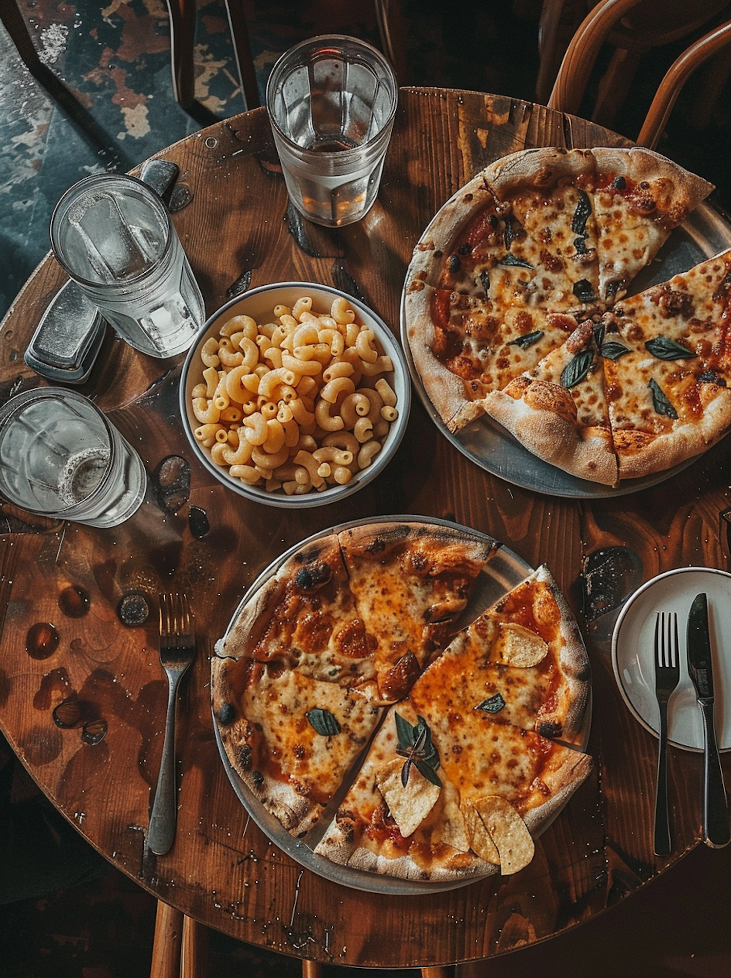 Rustic table with two pizzas, a bowl of macaroni, and glasses of water, creating a cozy dining scene.