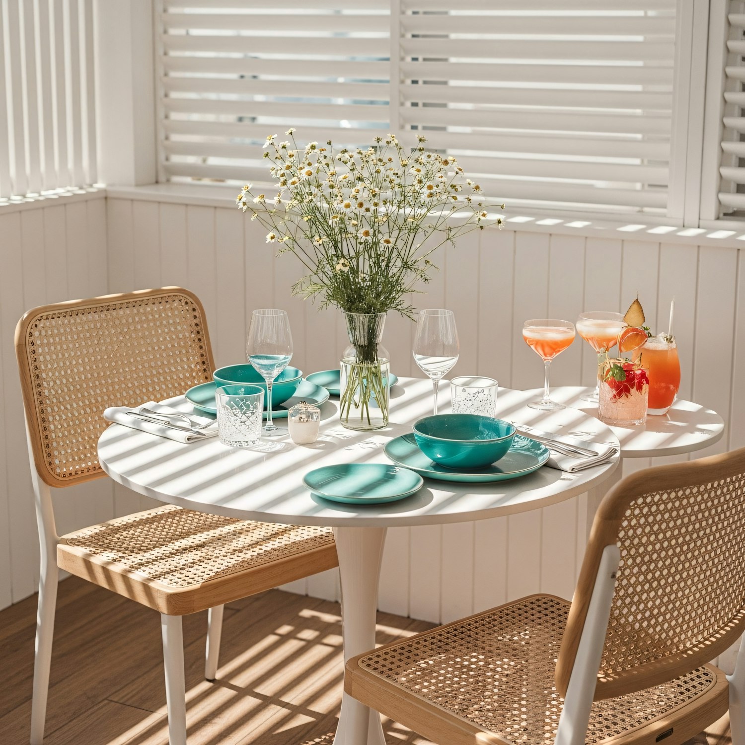 Bright dining setup with teal dishes, cocktails, and chamomile flowers on a white table, surrounded by rattan chairs and natural light.