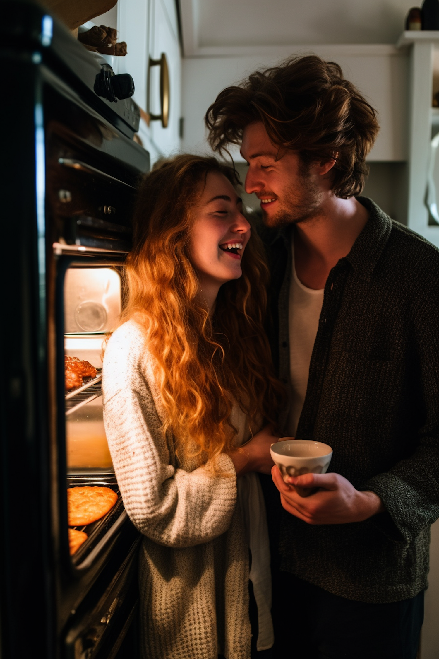 A joyful couple shares a warm moment in a cozy kitchen, illuminated by an open oven with baked goods.