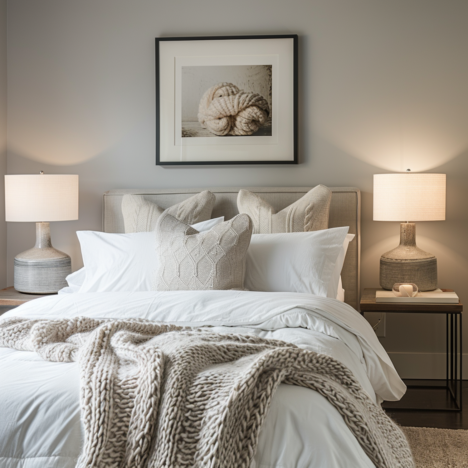 Cozy bedroom with white bedding, beige knit throw, and modern lamps. Neutral tones create a serene and elegant atmosphere.