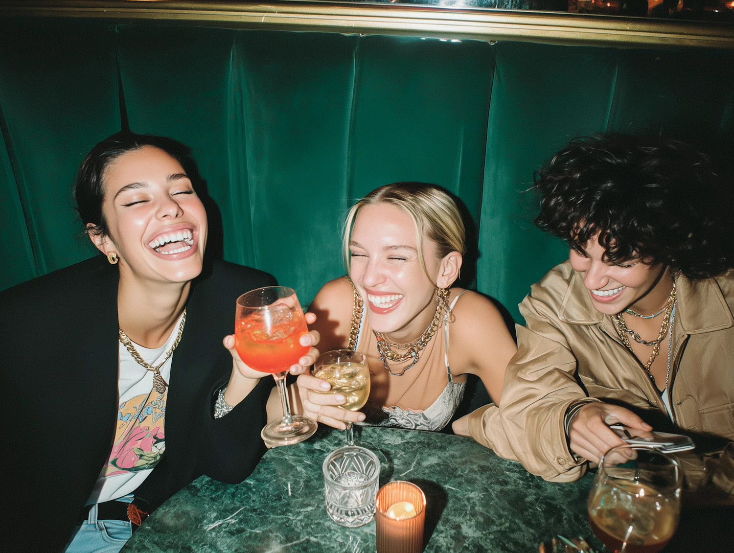 Three friends laughing and enjoying drinks at a stylish, cozy venue with a green marble table and warm lighting.