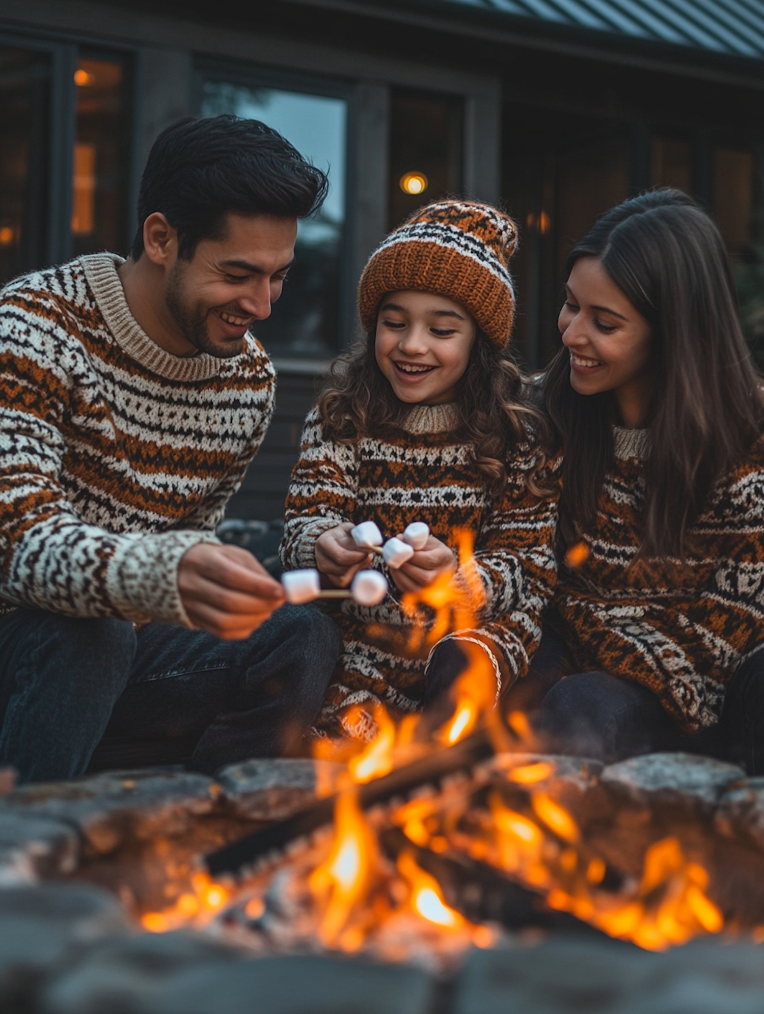 Family roasting marshmallows by a fire pit, wearing matching sweaters, creating a cozy and warm atmosphere.