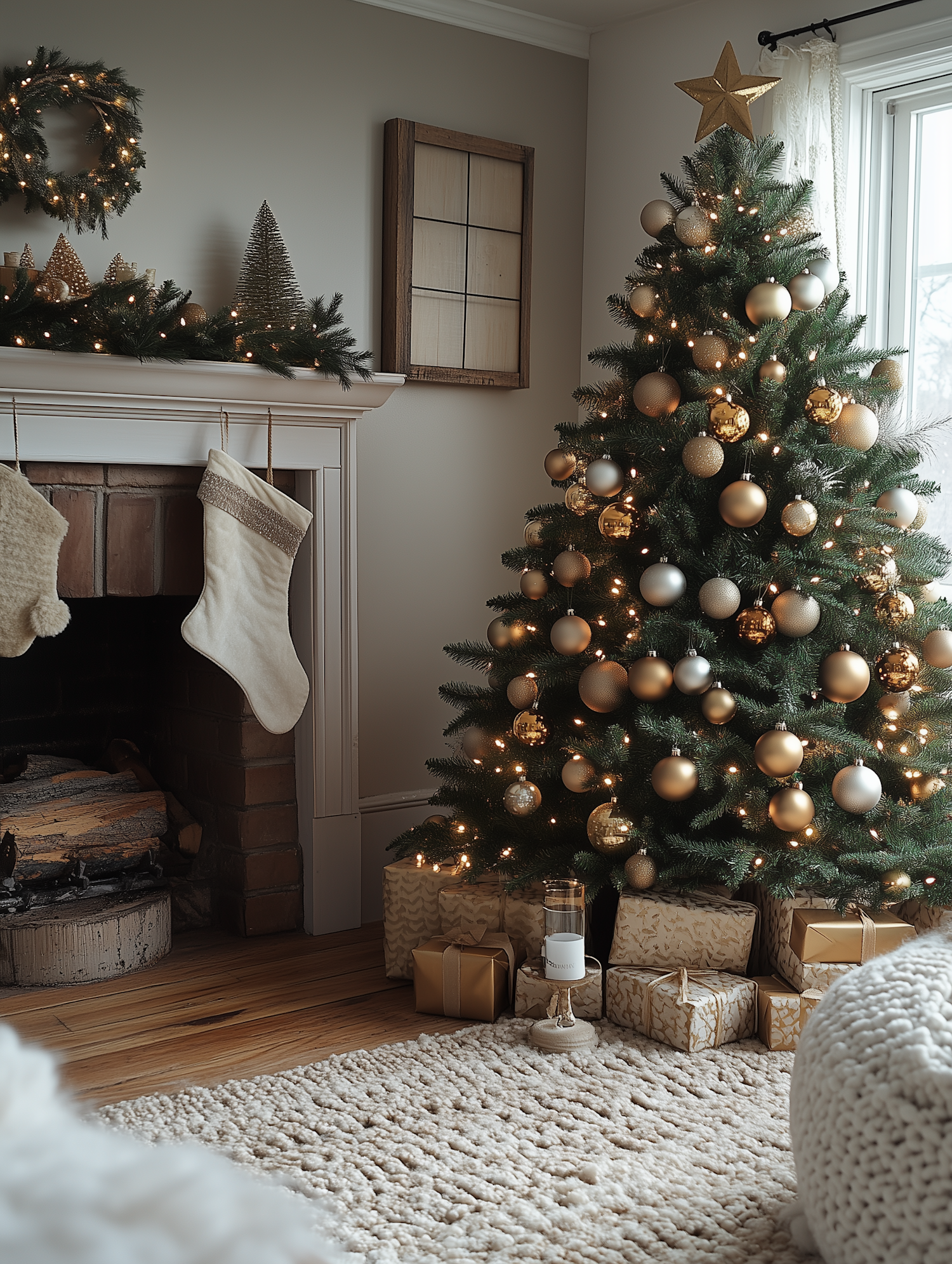 Cozy living room with a decorated Christmas tree, gold and silver ornaments, and a festive fireplace with stockings and a wreath.