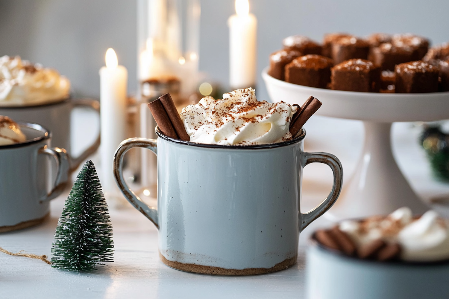Cozy winter scene with a mug of whipped cream and cinnamon, surrounded by candles and muffins, creating a festive atmosphere.