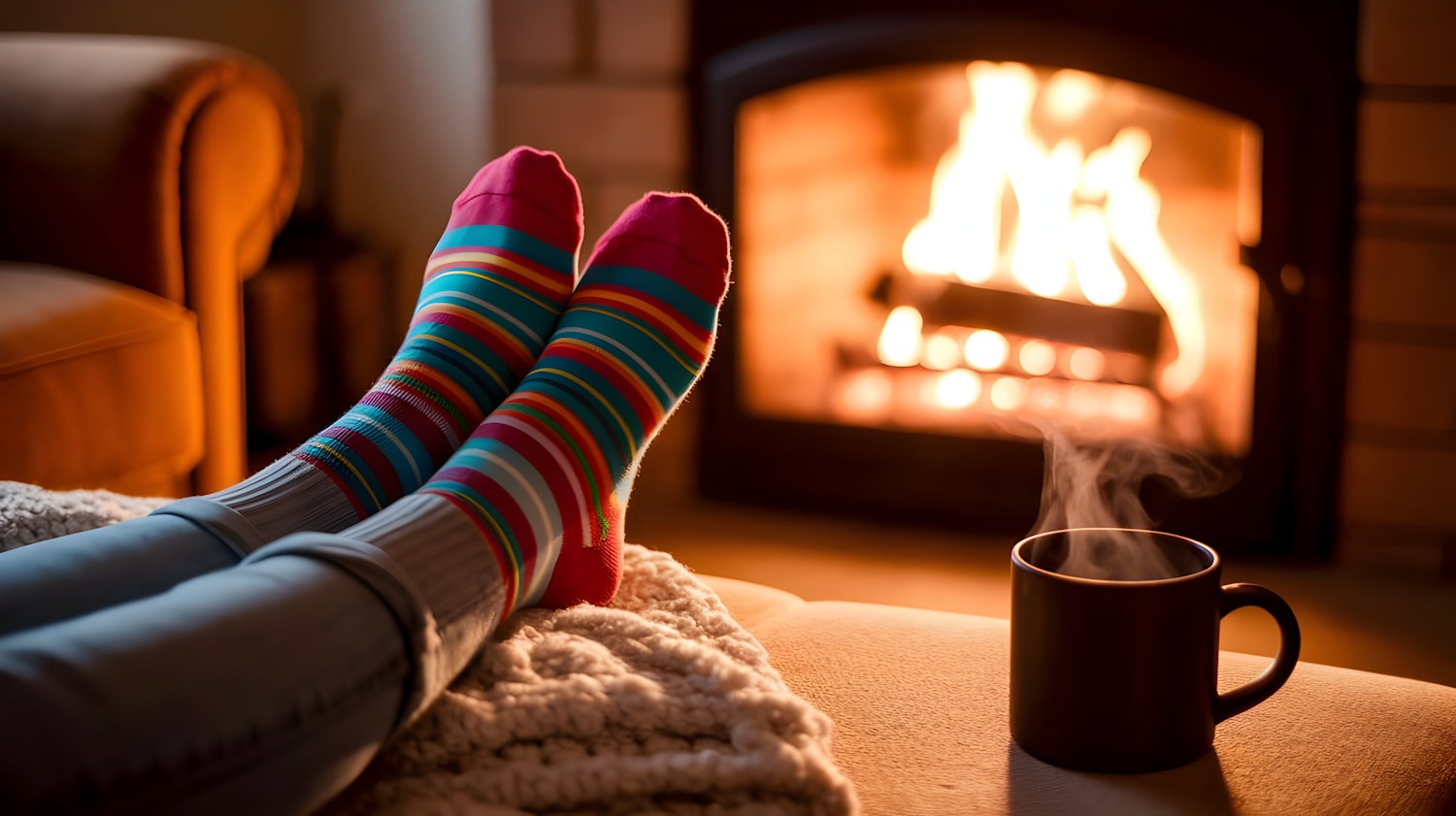 Relaxing by the fire with colorful socks, a cozy blanket, and a steaming mug of hot drink. Perfect for a chilly evening indoors.