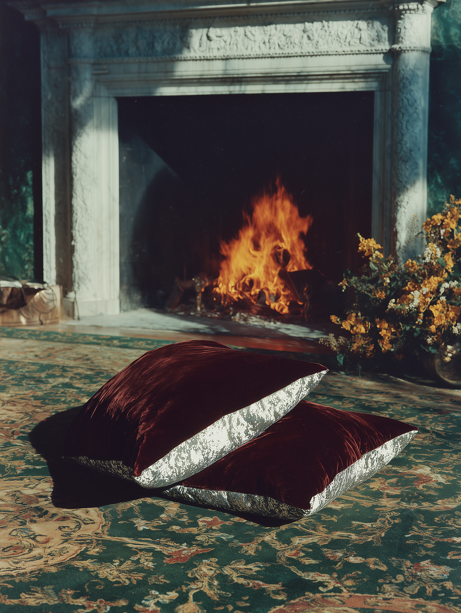 Luxurious velvet pillows on a patterned rug in front of a marble fireplace with a warm fire, creating a cozy and elegant ambiance.