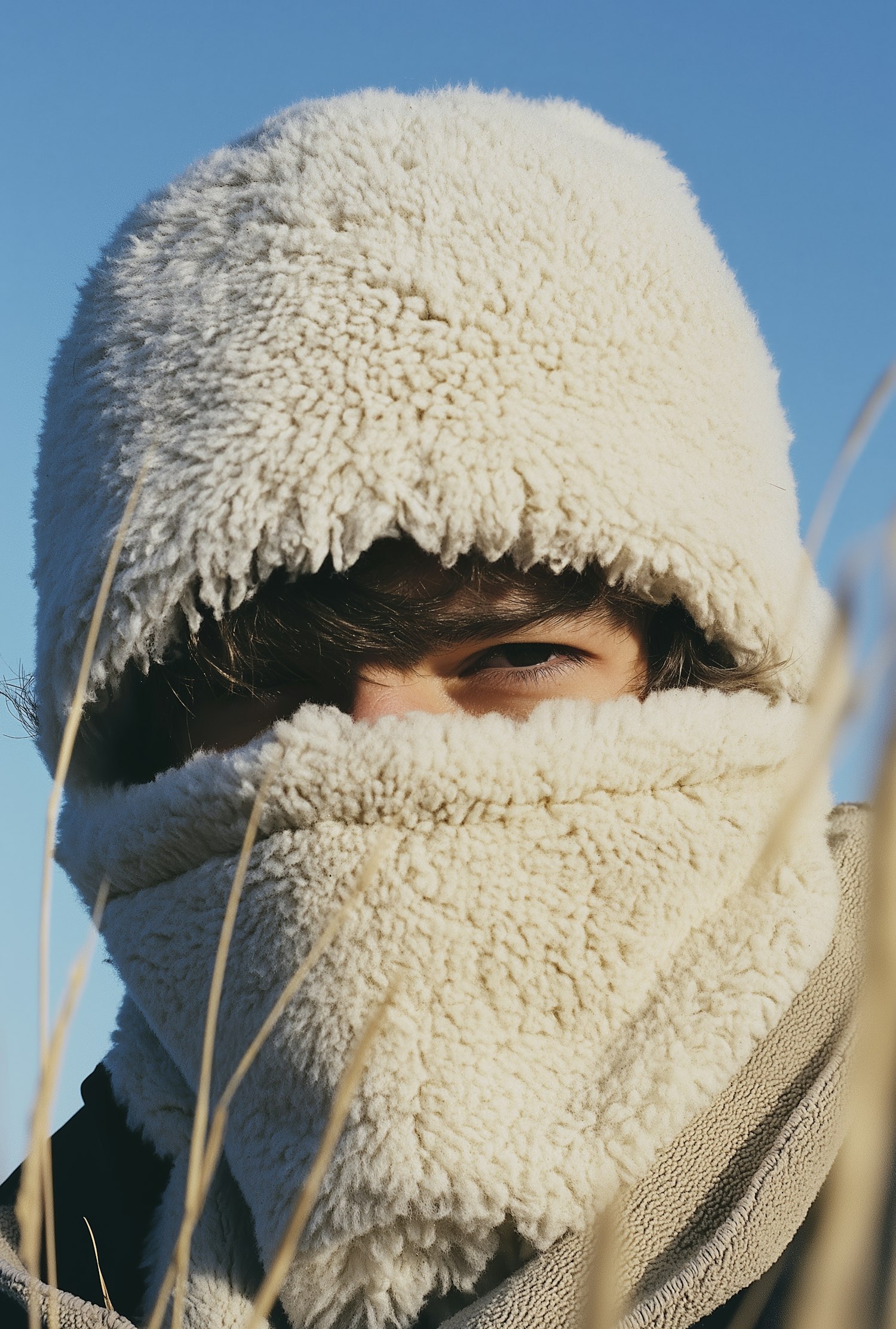 A person bundled in a cream fleece hood and scarf, with only their eyes visible, set against a clear blue sky and dry grass.