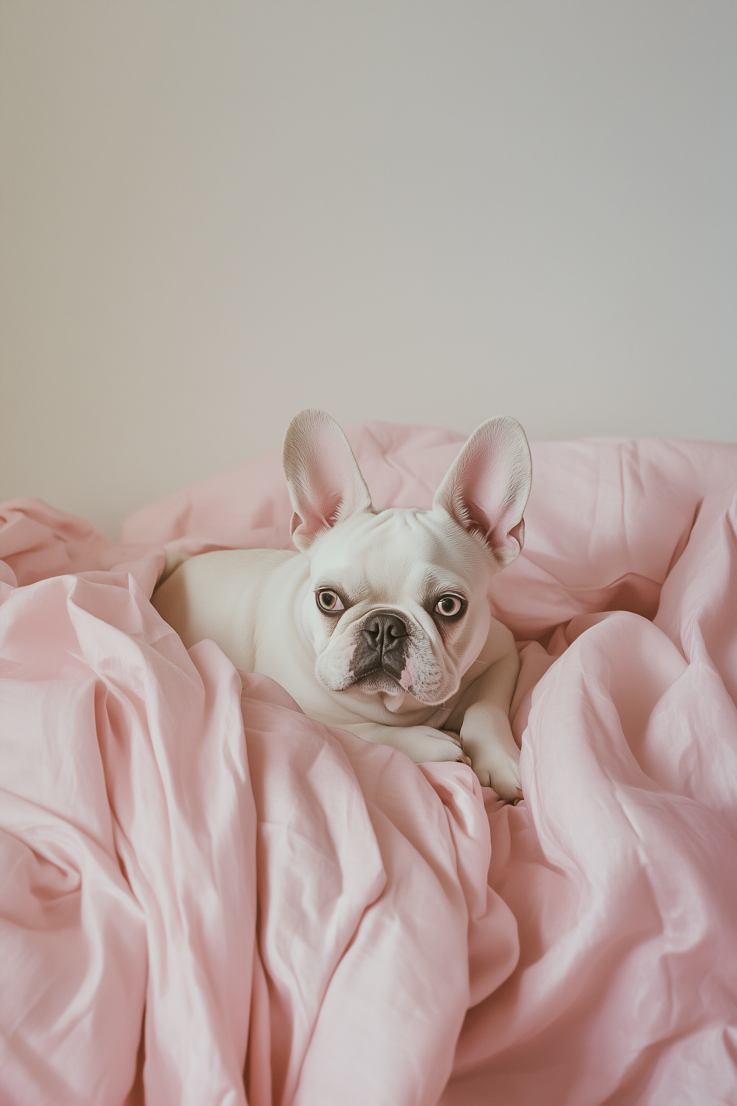 Adorable white French Bulldog resting on soft pink sheets, creating a cozy and inviting scene.