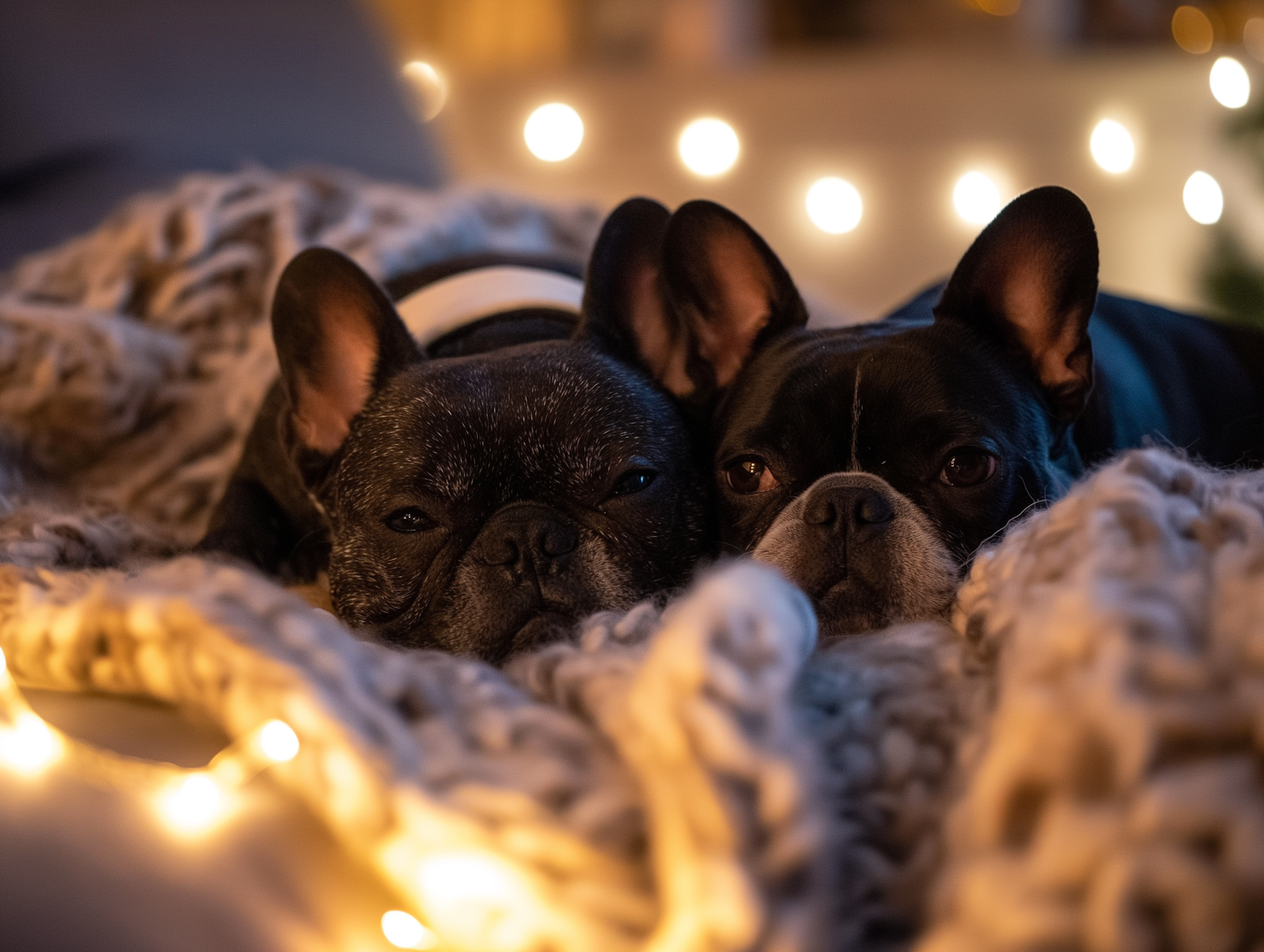 Two French Bulldogs snuggled on a cozy blanket with warm string lights in the background, creating a serene and intimate atmosphere.