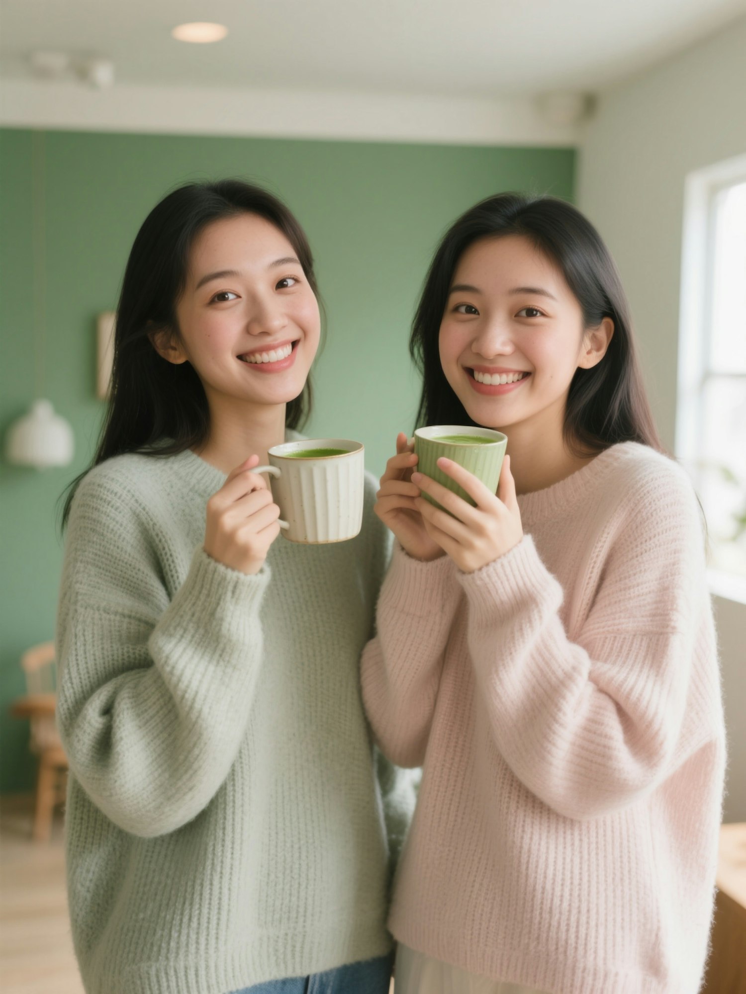 editorial-style indoor photography, soft natural light, pastel tones, candid Gen Z aesthetic, bright minimal background, warm vintage-inspired color grading, shallow depth of field, shot on a high-quality DSLR two girls in oversized ribbed sweaters holding mugs of matcha and tea close to their faces, smiling with wide eyes, standing in front of a painted green backdrop on the wall