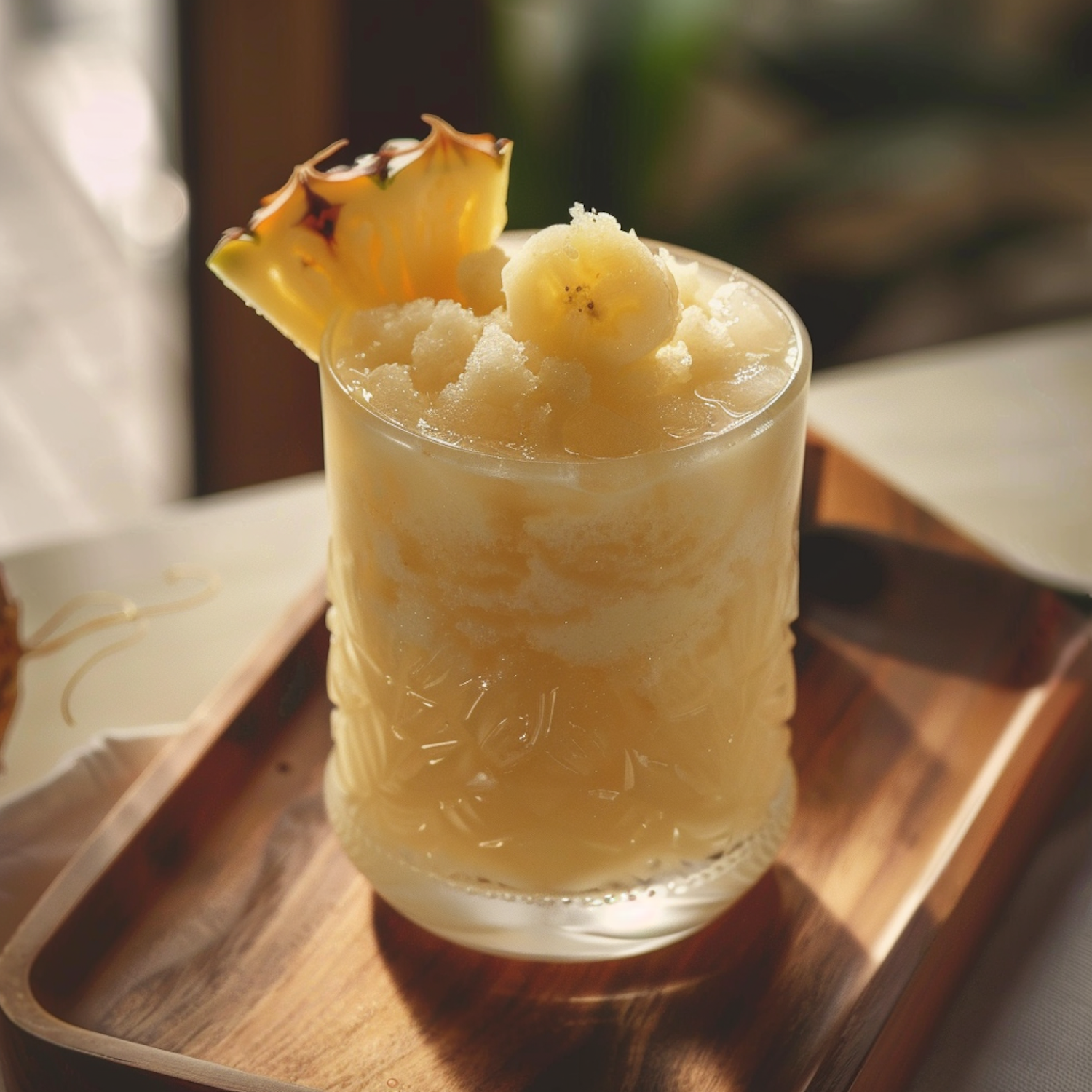 Refreshing frozen drink with pineapple and lychee garnish in a textured glass on a wooden tray, bathed in warm sunlight.