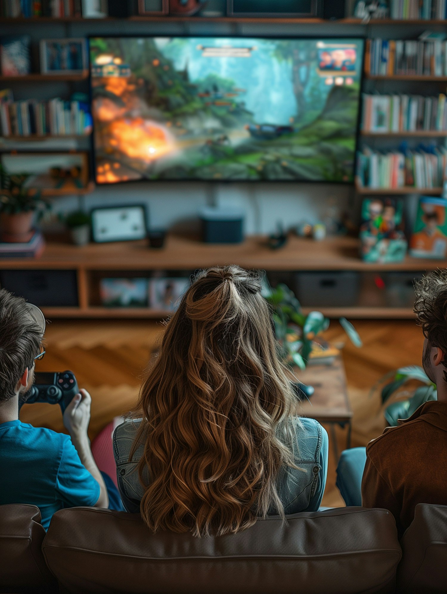 Three people gaming in a cozy living room, focused on a vibrant action game on a large TV screen.