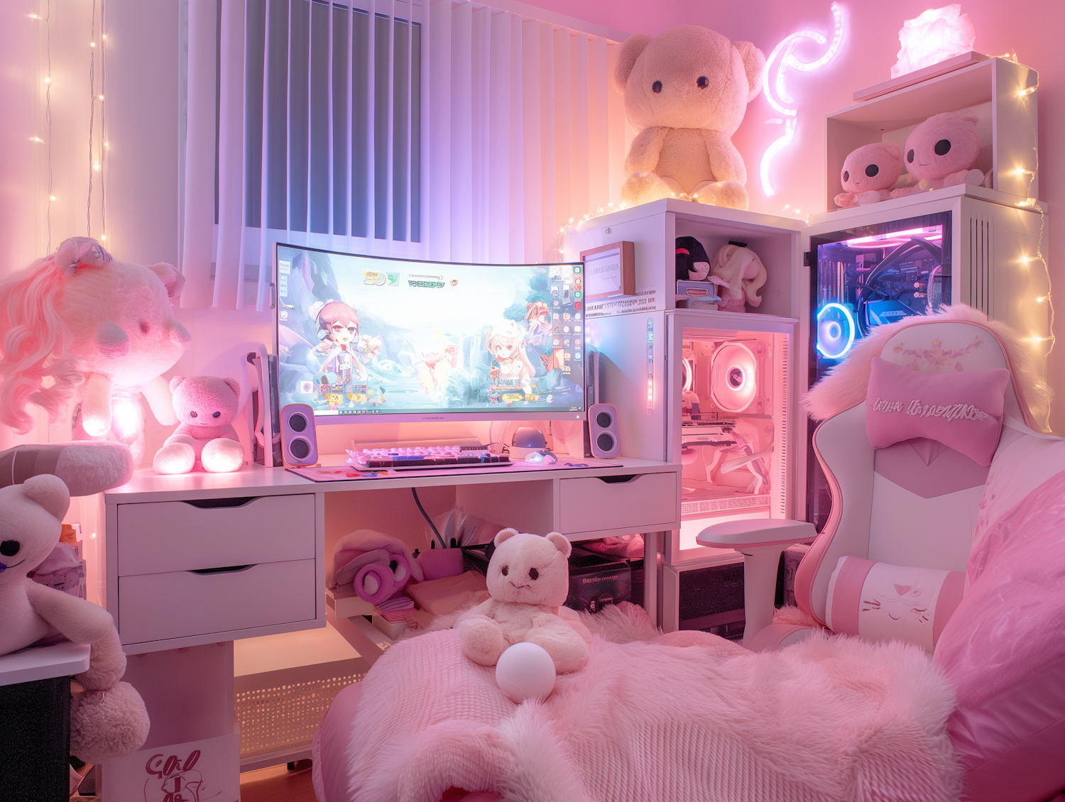 Cozy pink gaming setup with plush toys, curved monitor, and glowing PC. Perfect blend of comfort and tech for gamers.