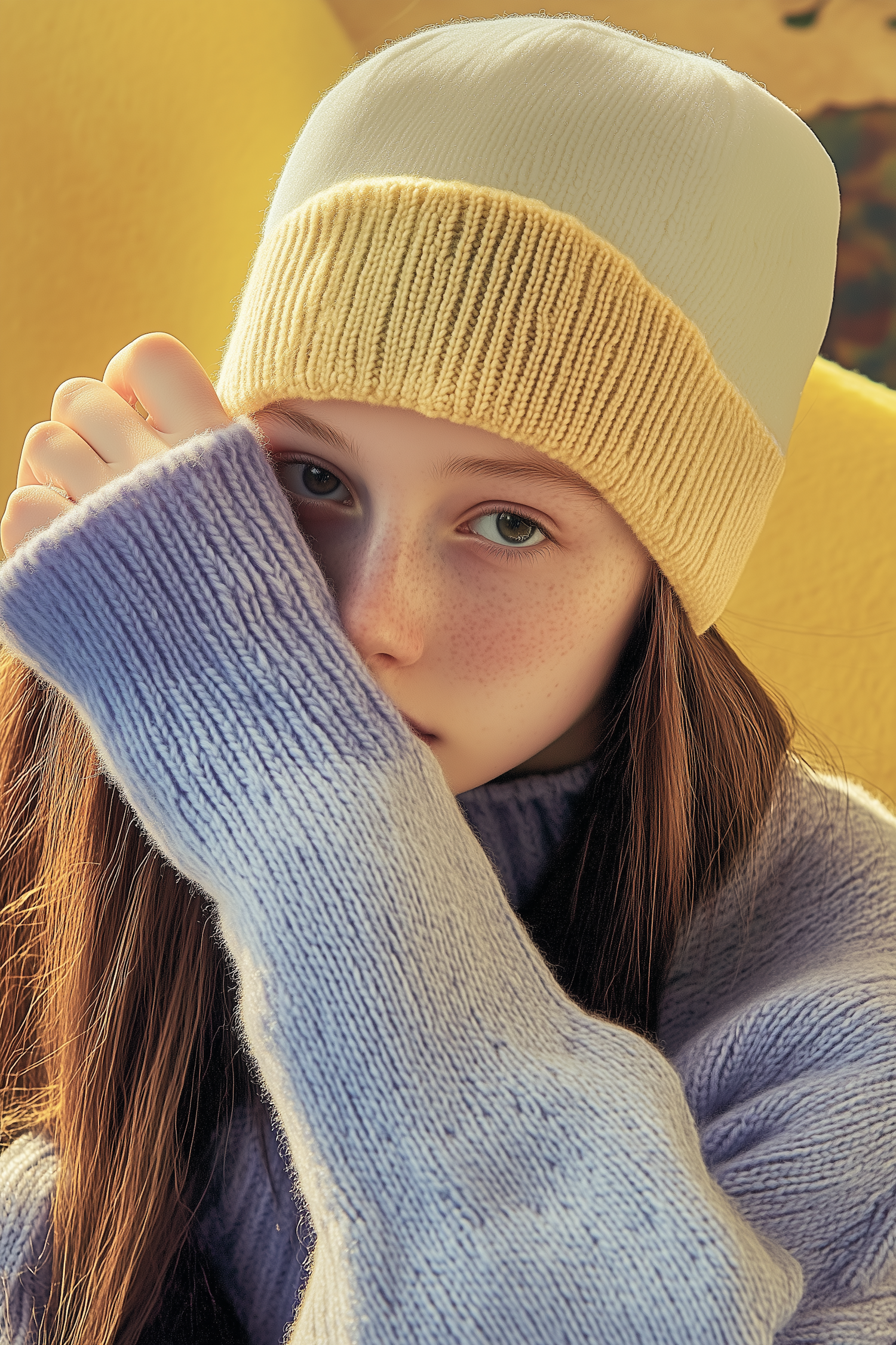 A young girl in a lavender sweater and yellow beanie gazes thoughtfully at the camera, her green eyes framed by soft, natural lighting.