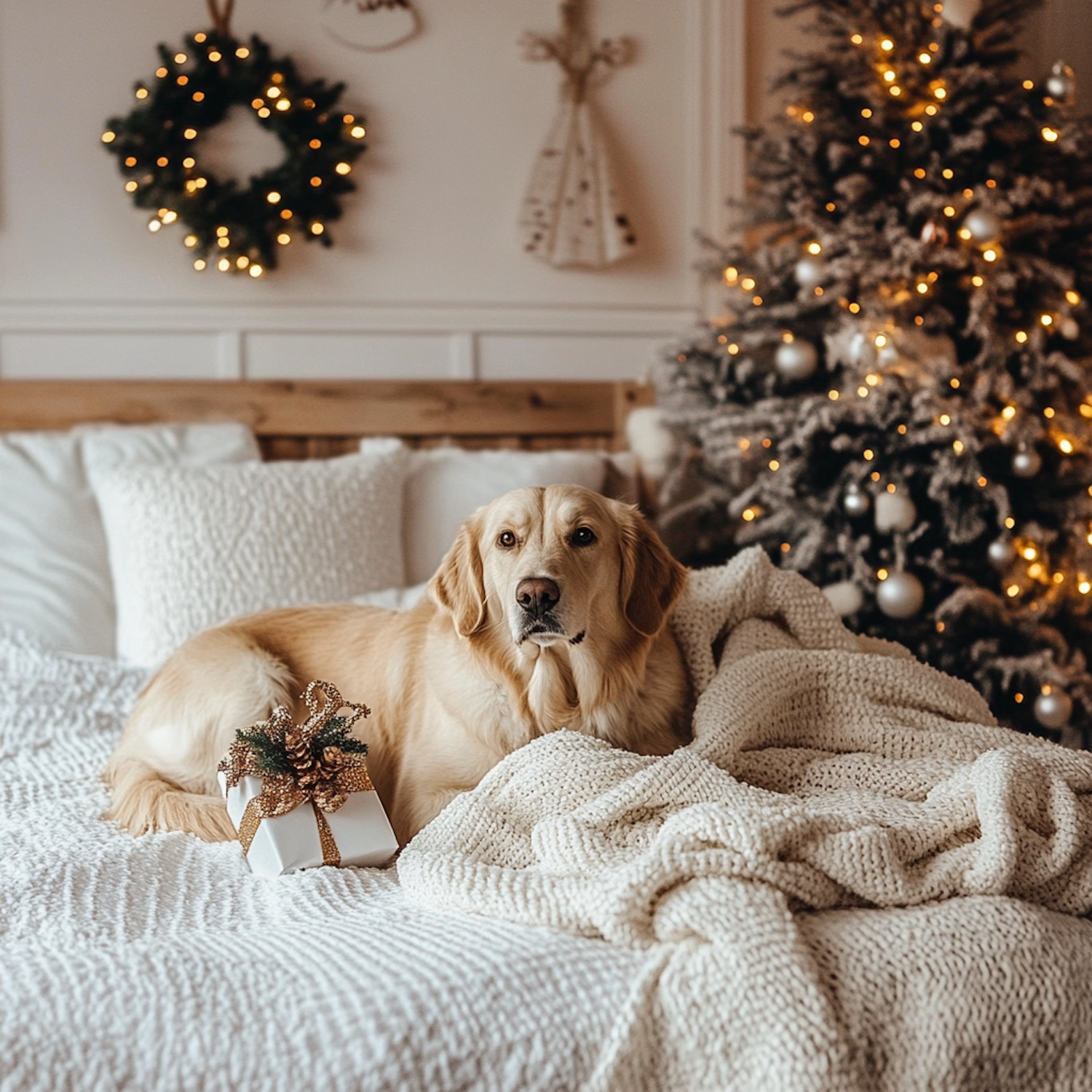 Golden retriever on a cozy bed with a Christmas tree and gift, creating a warm holiday ambiance.