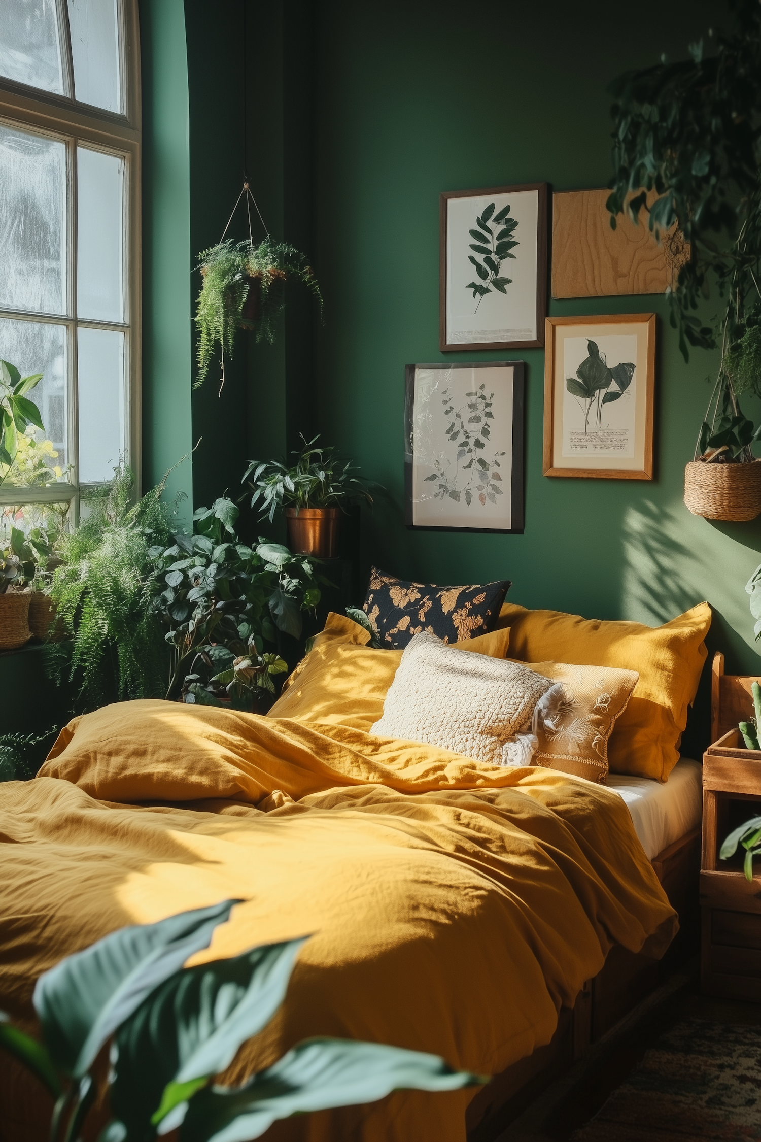 Cozy bedroom with mustard yellow bedding, green walls, botanical prints, and lush plants creating a serene, nature-inspired vibe.