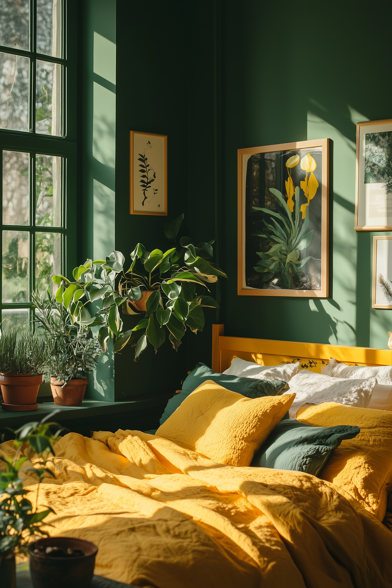 Sunlit green bedroom with lush plants, yellow bedding, and botanical wall art, creating a cozy and nature-inspired retreat.