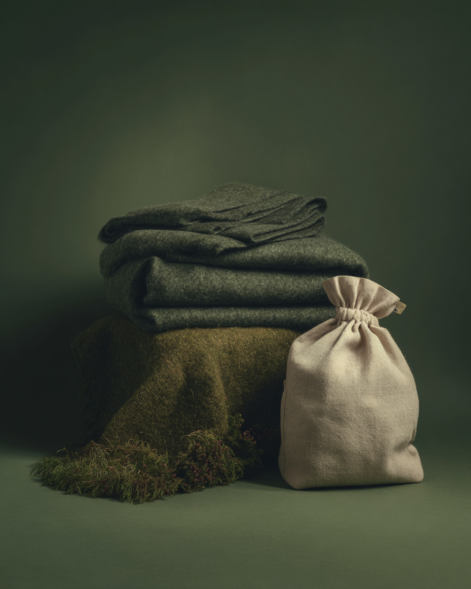 Folded green woolen blankets and a beige drawstring bag on a mossy surface, set against a muted green background.