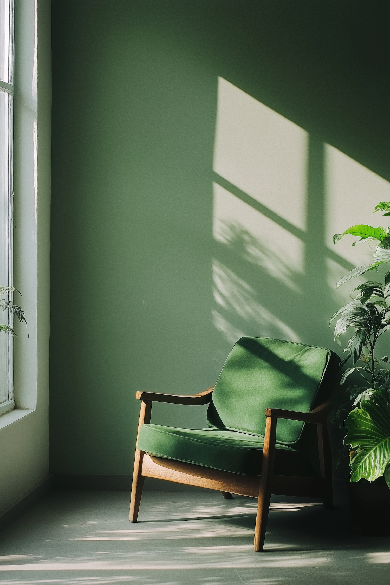 A green armchair by a sunlit window, paired with a lush potted plant, creating a serene and minimalist interior vibe.