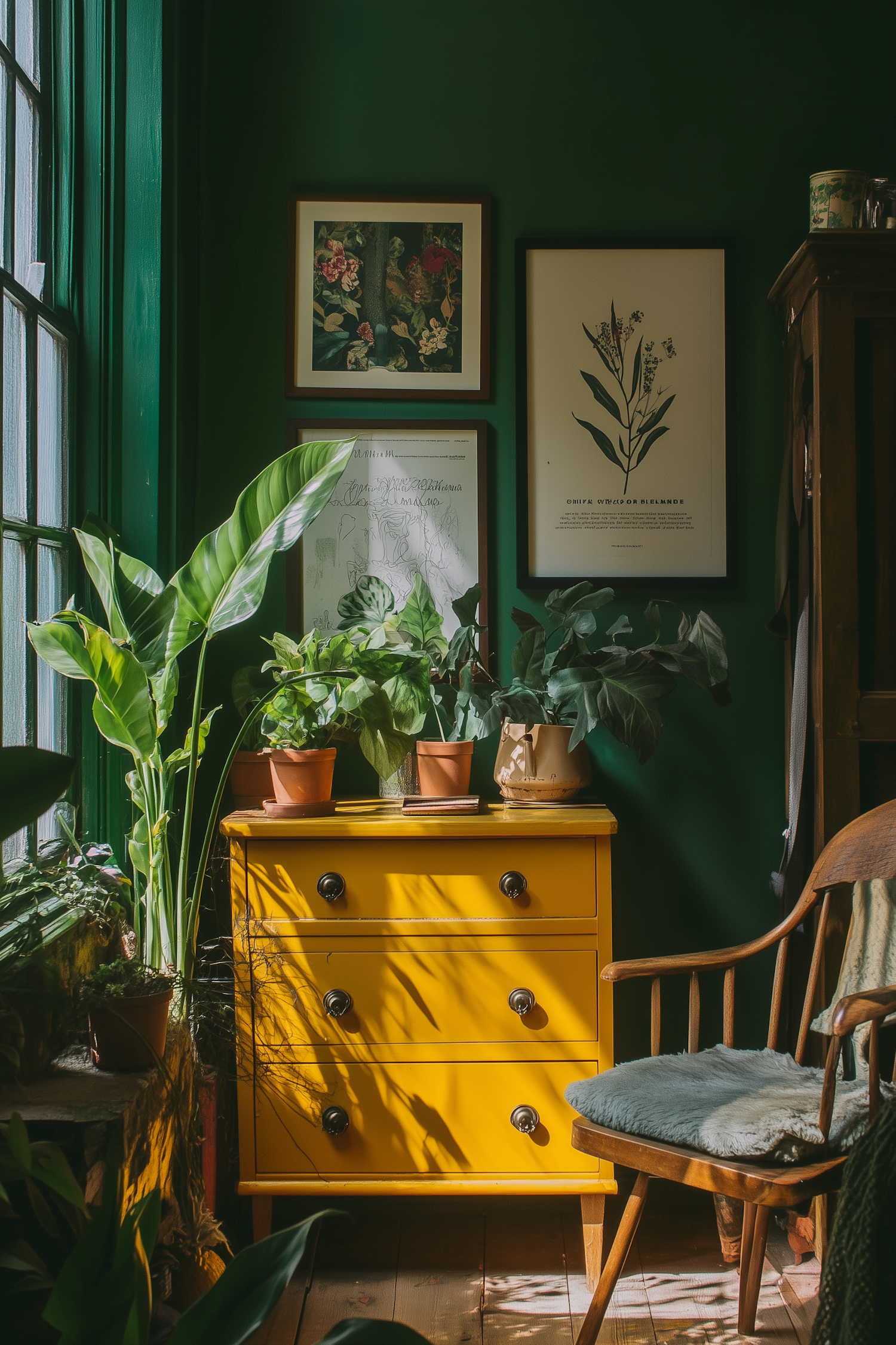 Bright yellow chest of drawers with potted plants, framed botanical art, and sunlight streaming into a cozy green-walled corner.