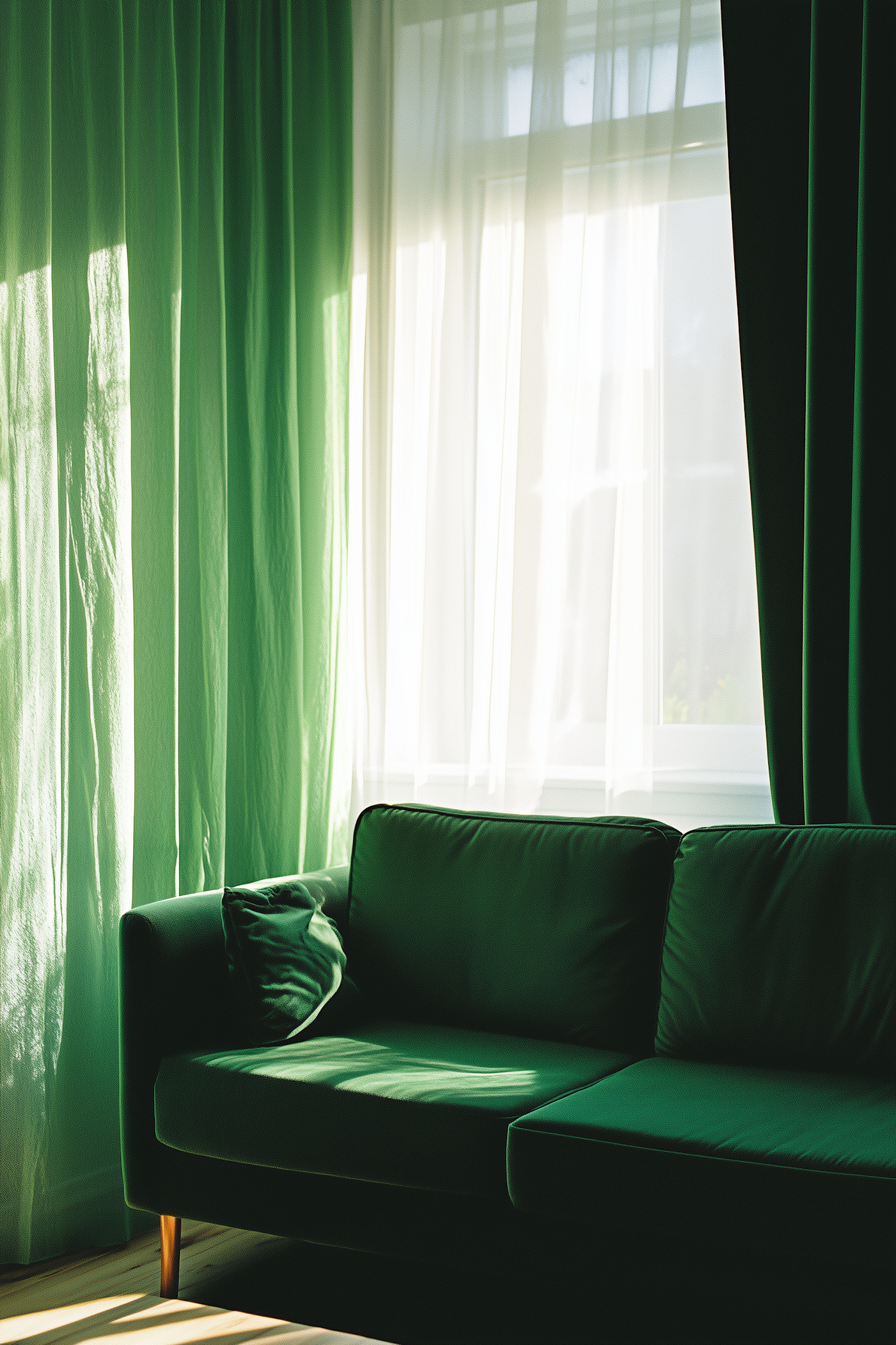 A stylish green velvet sofa by a sunlit window with matching curtains, creating a cozy and modern living room vibe.