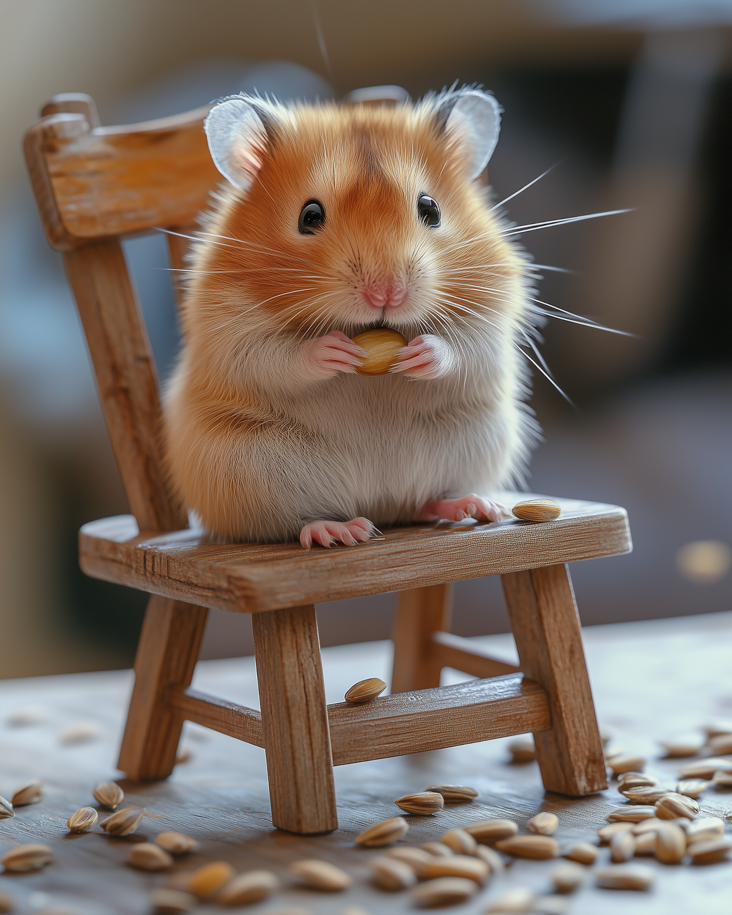 Adorable hamster with golden-brown fur sits on a tiny wooden chair, holding a seed. Scattered seeds add a playful touch.