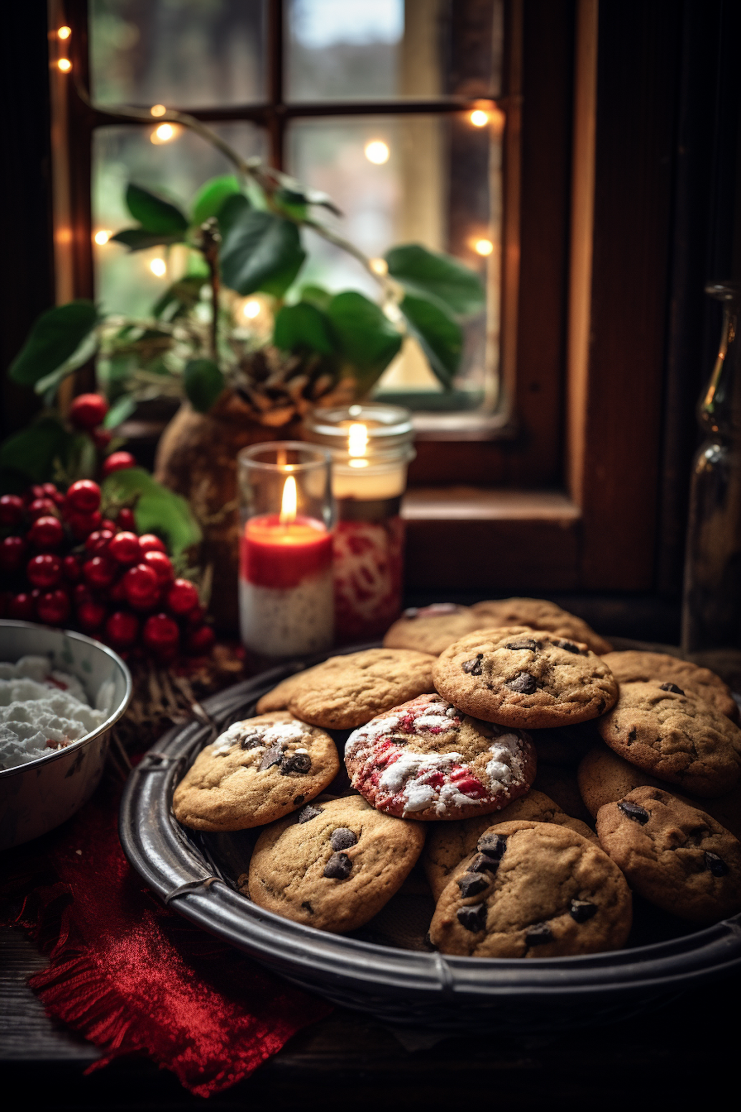 Warm, cozy scene with chocolate chip cookies, festive lights, and candles by a window. Perfect for holiday baking inspiration.