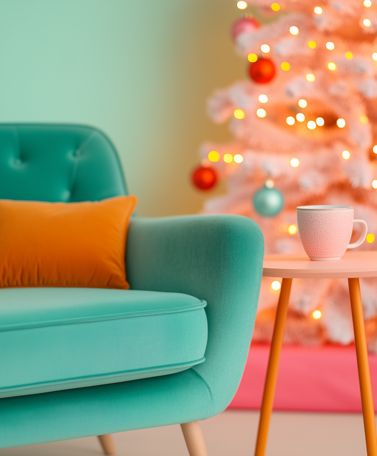 Cozy living room with teal armchair, orange cushion, pink mug, and festive white Christmas tree with colorful ornaments.