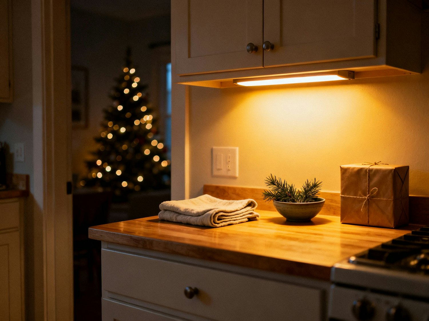 Neutral kitchen at night with light cabinetry and wood counter, warm under-cabinet or nearby lamp light giving a cozy pool on the countertop; on the counter a folded linen towel, small bowl with evergreen sprig, and one wrapped gift to hint the season; far doorway shows out-of-focus Christmas tree lights glowing in the other room. 35 mm, f/2.8, ISO 800, 1/80 s; warm WB. Negative: festive lettering, blinking lights, cluttered appliances.