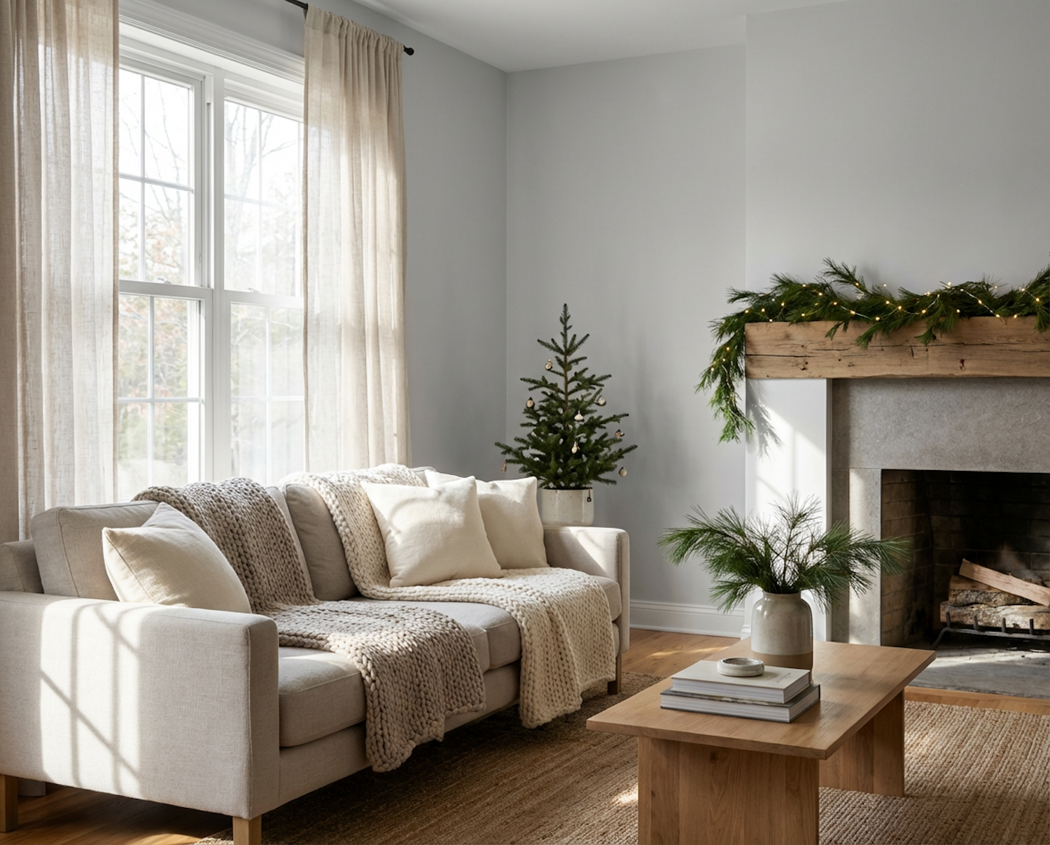 A cozy living room with a beige sofa, festive greenery, and a small Christmas tree, creating a warm and inviting holiday atmosphere.