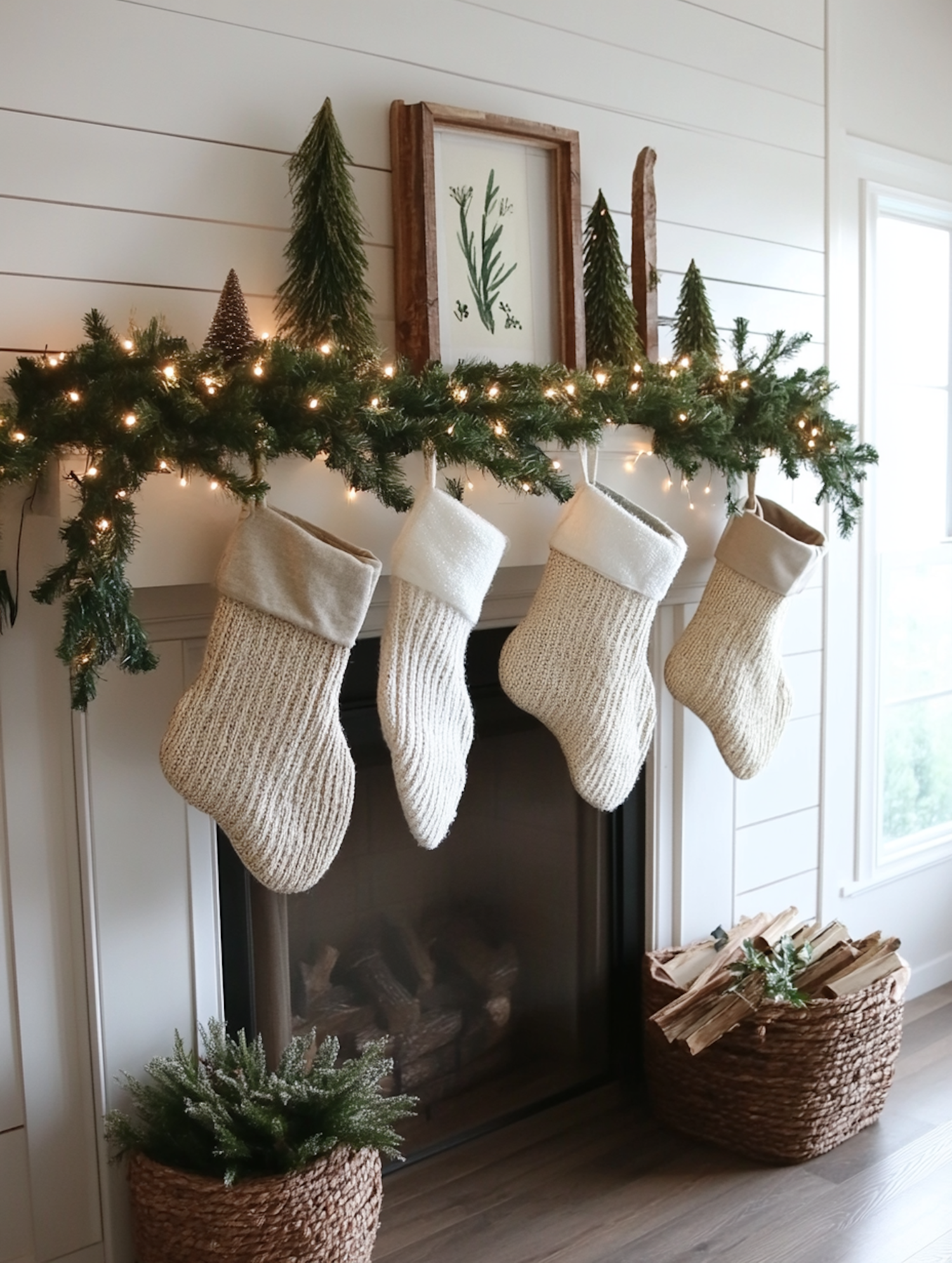 Cozy fireplace with knitted stockings, pine garland, and rustic decor for a festive holiday atmosphere.