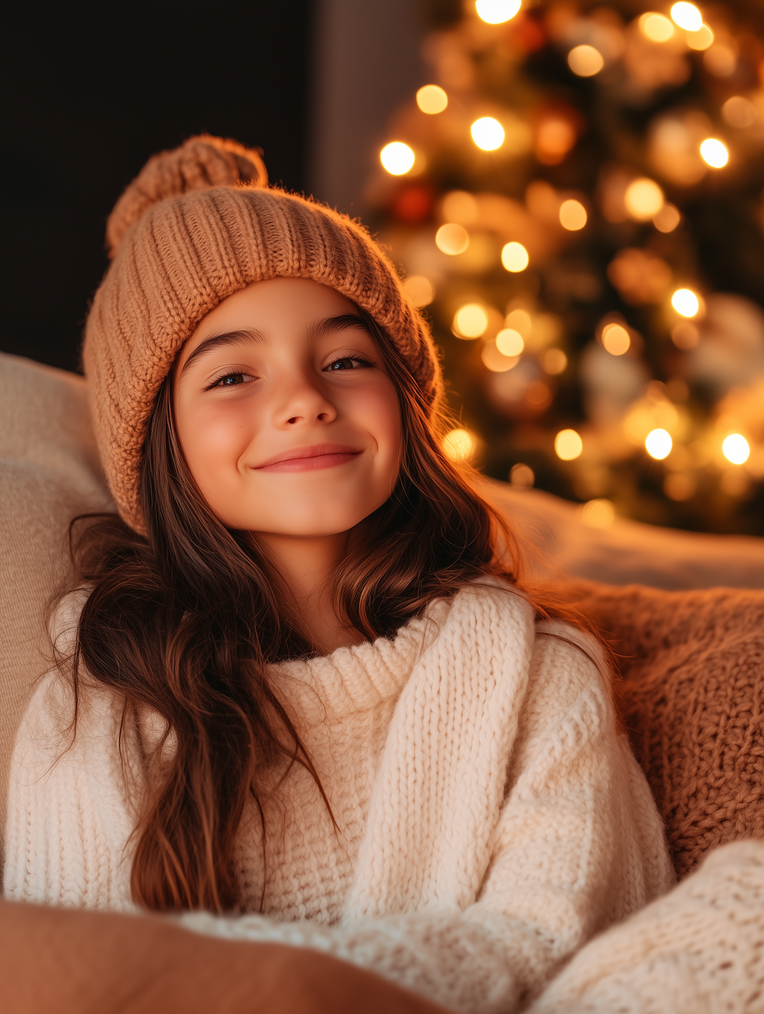 Smiling girl in cozy knitwear with festive Christmas lights in the background, creating a warm and joyful holiday atmosphere.