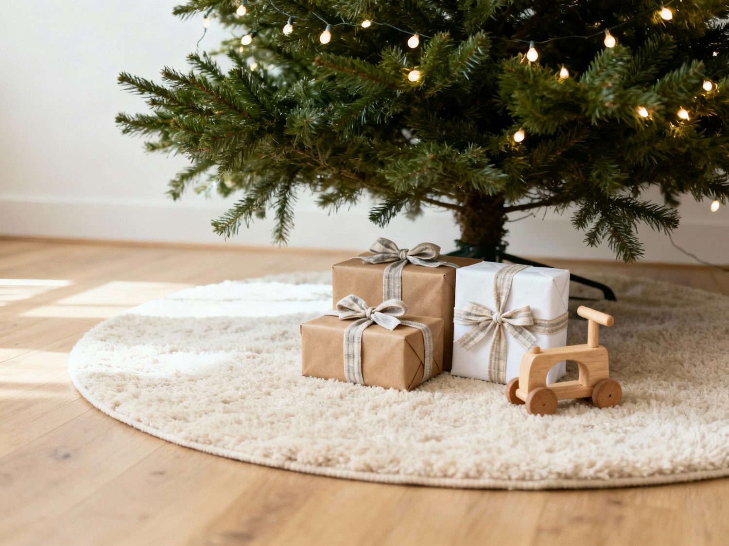 Daytime Christmas scene on light wood floor near the tree, soft round rug, two or three wrapped presents in kraft and white paper with fabric ribbons, simple wooden toy placed beside them, tree lights softly glowing in background, wall clean; bright, wholesome, family-friendly mood. 35 mm, f/4, ISO 100, 1/160 s. Negative: branded toys, loud colors, clutter, HDR.